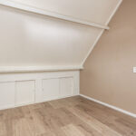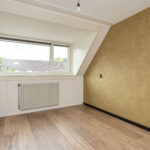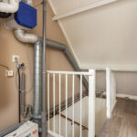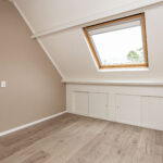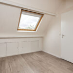 Vaste trap naar de voorzolder met wasmachineaansluiting en een dakraam. Vanuit hier toegang tot een derde slaapkamer met groot dakraam, extra opbergruimte achter knieschotten en inbouwspots.