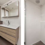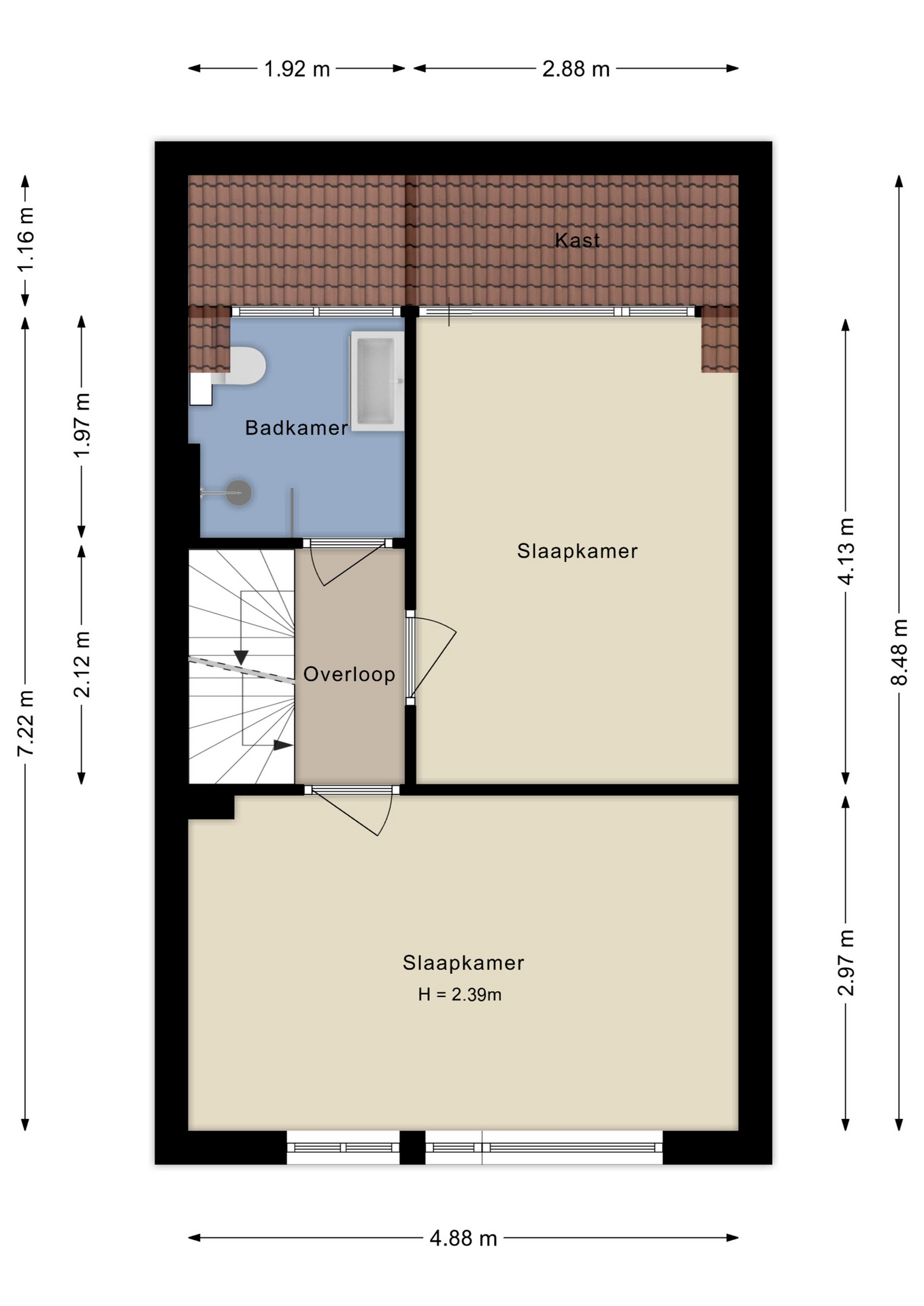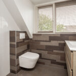 Overloop met toegang tot alle vertrekken. De ruime hoofdslaapkamer ligt over de gehele breedte aan de voorzijde. Aan de achterzijde bevindt zich een tweede slaapkamer met dakkapel en de moderne badkamer. Deze is uitgerust met een inloop regendouche, inbouwkranen, tweede zwevend toilet, wastafelmeubel met spiegel, handdoekradiator en inbouwspots. Dankzij de dakkapel valt hier veel daglicht binnen.
