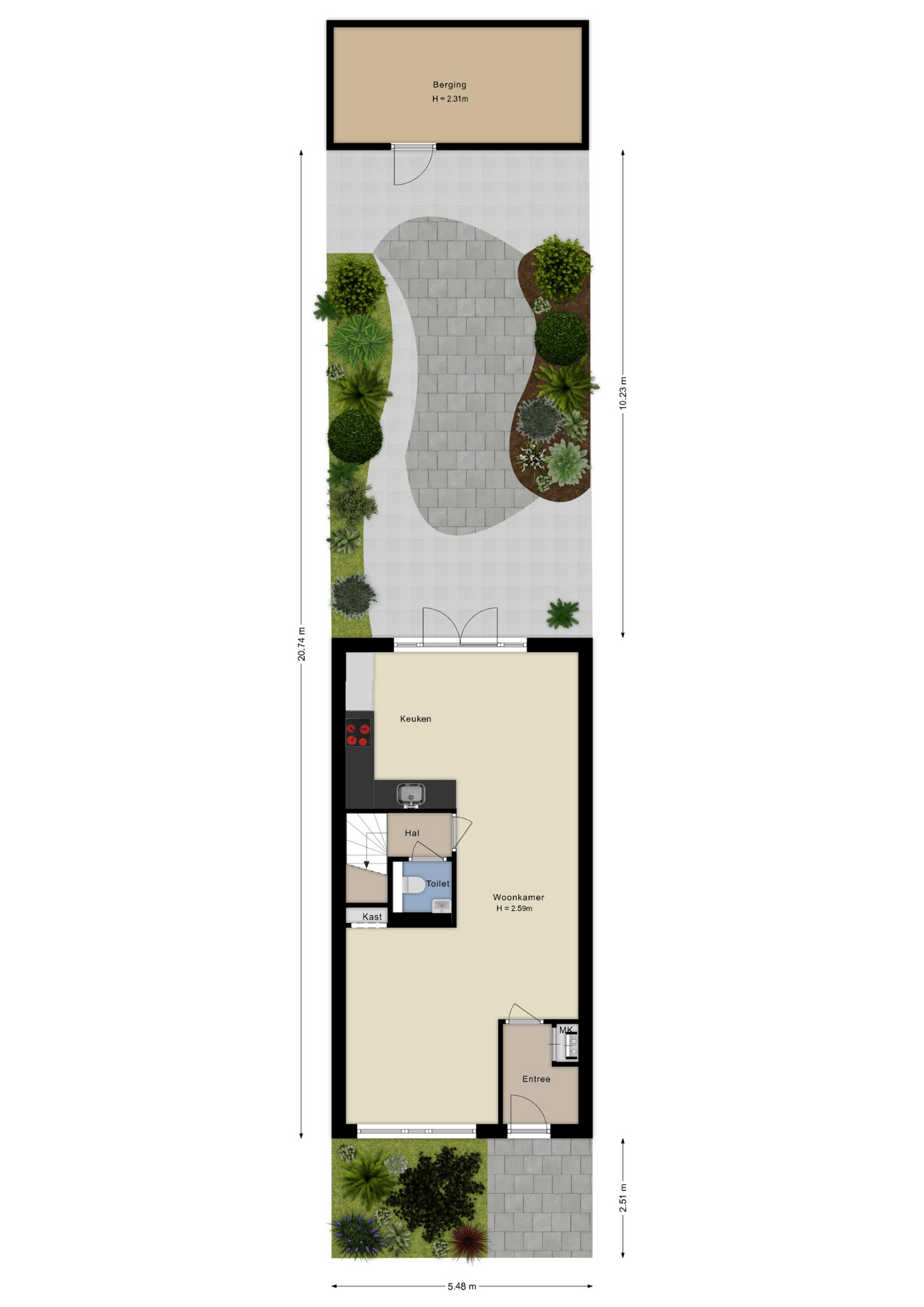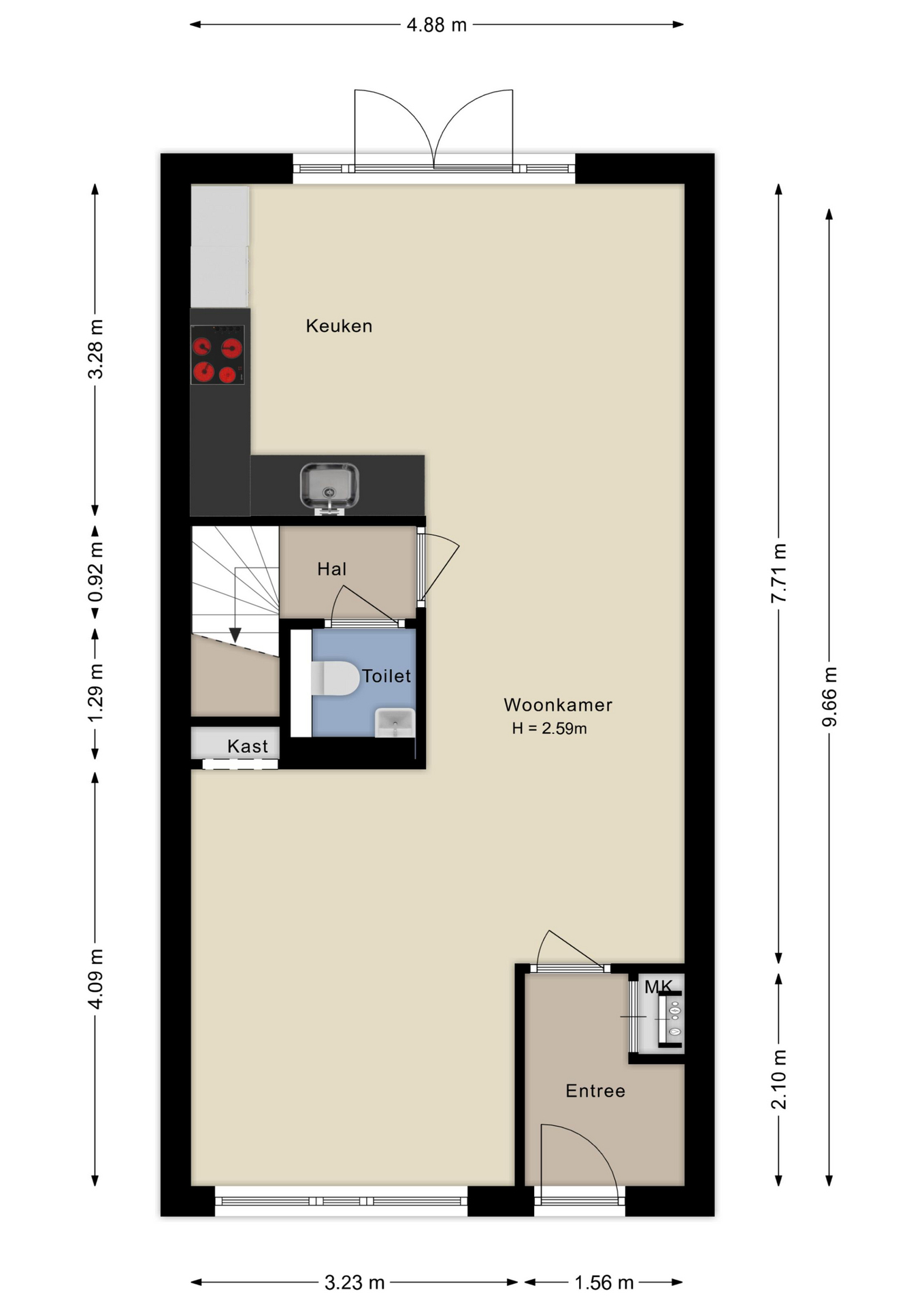 Entree met hal, meterkast en toegang tot de lichte woonkamer aan de voorzijde. De woonkamer biedt volop mogelijkheden om een gezellige en comfortabele living te creëren. Aan de achterzijde vind je de nette hoekkeuken, compleet met inductiekookplaat, afzuigkap, vaatwasser, combi-magnetron en koel-vriescombinatie. Het verlaagde plafond met inbouwspots geeft een eigentijdse uitstraling. Via dubbele deuren stap je zo de fraai aangelegde achtertuin in. In het midden van de woning bevinden zich het toilet, zwevend model met fonteintje, en de trapopgang.