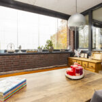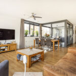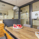 De loggia is van de woonkamer gescheiden door een glazen pui.