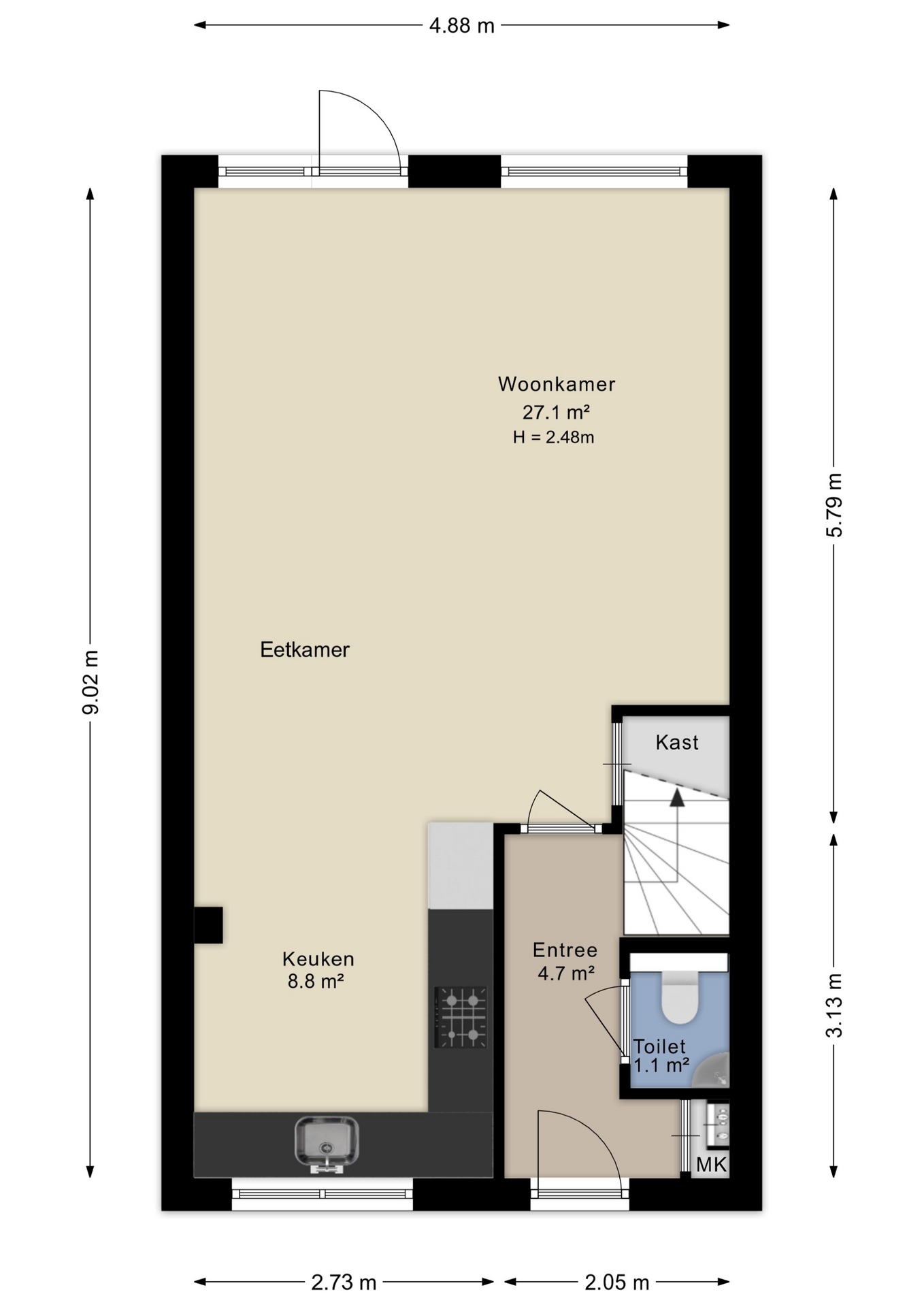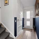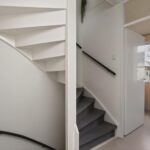 Je komt binnen in de hal met meterkast, garderobe, modern toilet en trapopgang. Aan de voorzijde bevindt zich de ruime keuken, compleet uitgerust met diverse inbouwapparatuur en een fijn vrij uitzicht. Aan de achterzijde ligt de tuingerichte woonkamer met praktische trapkast en directe toegang tot de zonnige achtertuin. De begane grond is strak afgewerkt met een moderne eikenhouten vloer en gestucte wanden.