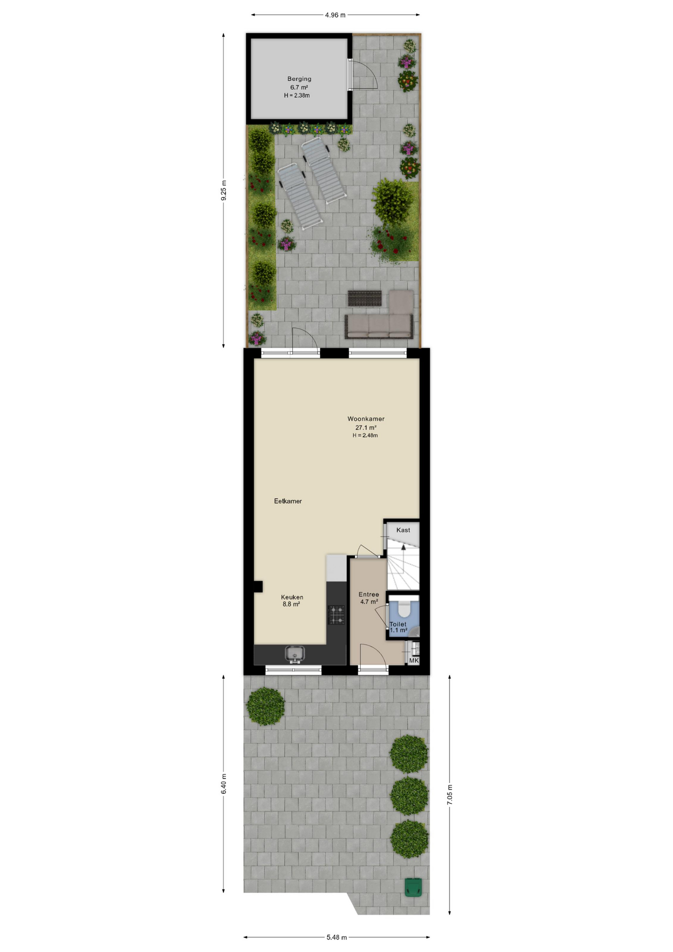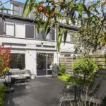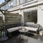 De achtertuin is onderhoudsvriendelijk aangelegd, ligt op het zuiden en biedt volop privacy. Hier geniet je van de zon, met extra gemak dankzij de buitenkraan, verlichting en het zonnescherm. Achterin de tuin staat een vrijstaande houten berging met elektra en er is een praktische achterom.