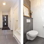 Entree, hal met modern afgewerkte toiletruimte met hangend closet, meterkast met vernieuwde groepenkast en elektra, trapopgang en toegang tot de woonkamer.