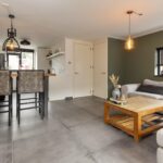 Tuingerichte woonkamer voorzien van tegelvloer (90x90cm tegels) en vloerverwarming, glad gestucte wanden en plafond met sierlijst en praktische trapkast.