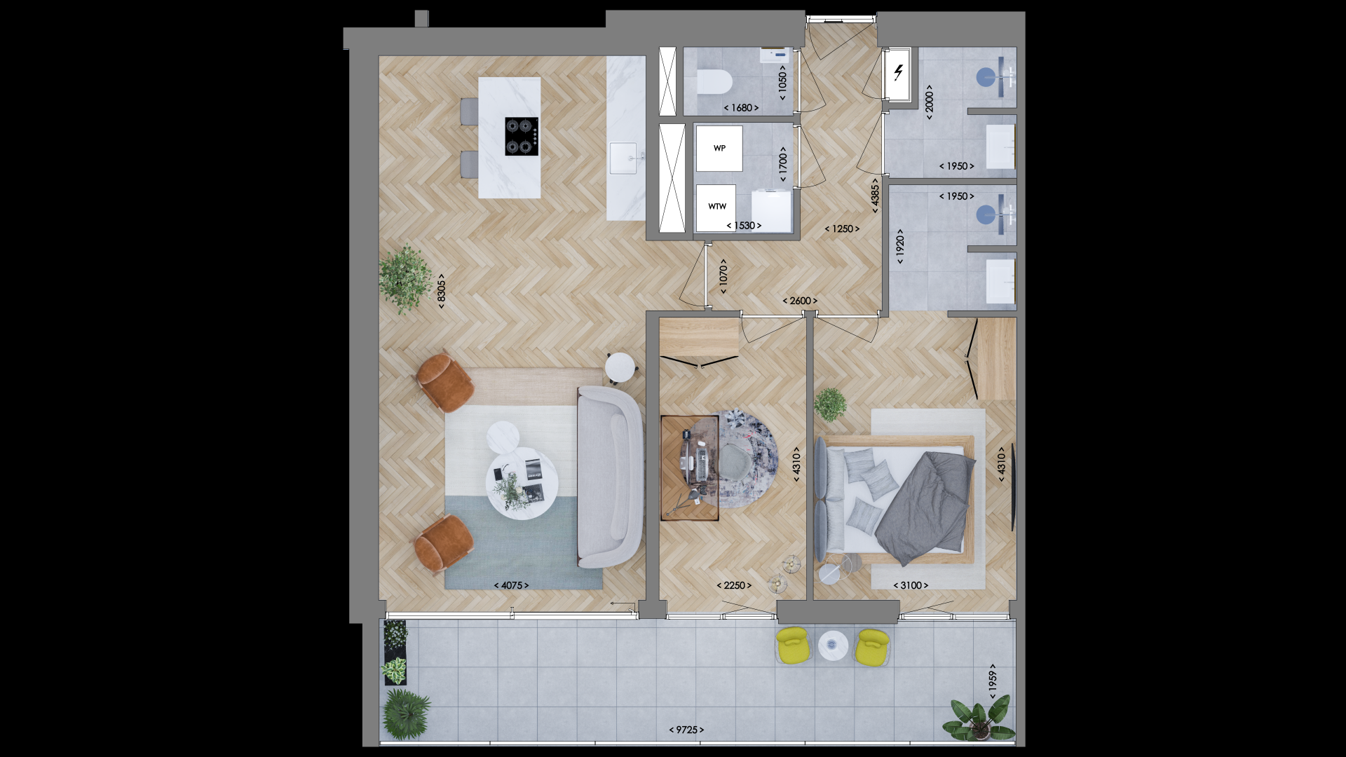 Alle appartementen zijn op het zuiden én in de breedte georiënteerd. Door dit ontwerp van Centrum Architecten profiteren alle appartementen maximaal van de zonnige ligging en de buitengewone hoeveelheid lichtinval. Elk appartement heeft een zeer royaal balkon over de volle breedte van de woning en daarmee een buitenruimte van 19 m2 of meer. Door de grote raampartijen geniet je van vanuit je woonkamer én beide slaapkamers van weidse uitzichten over groen en water.