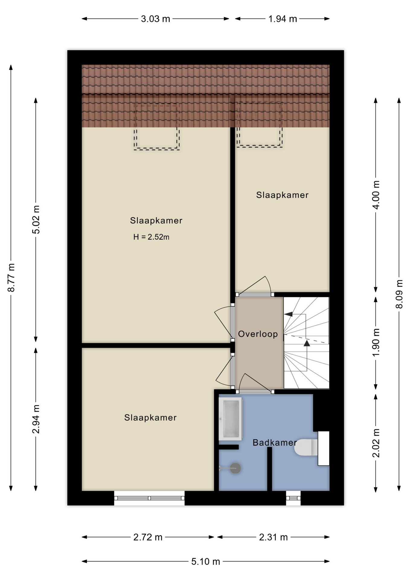 Op de eerste etage vind je drie ruime slaapkamers, waarvan de hoofdslaapkamer is voorzien van een airco. Achter de knieschotten aan de achterzijde bevindt zich extra bergruimte. De moderne badkamer is compleet ingericht met een inloopdouche, wastafelmeubel en toilet.