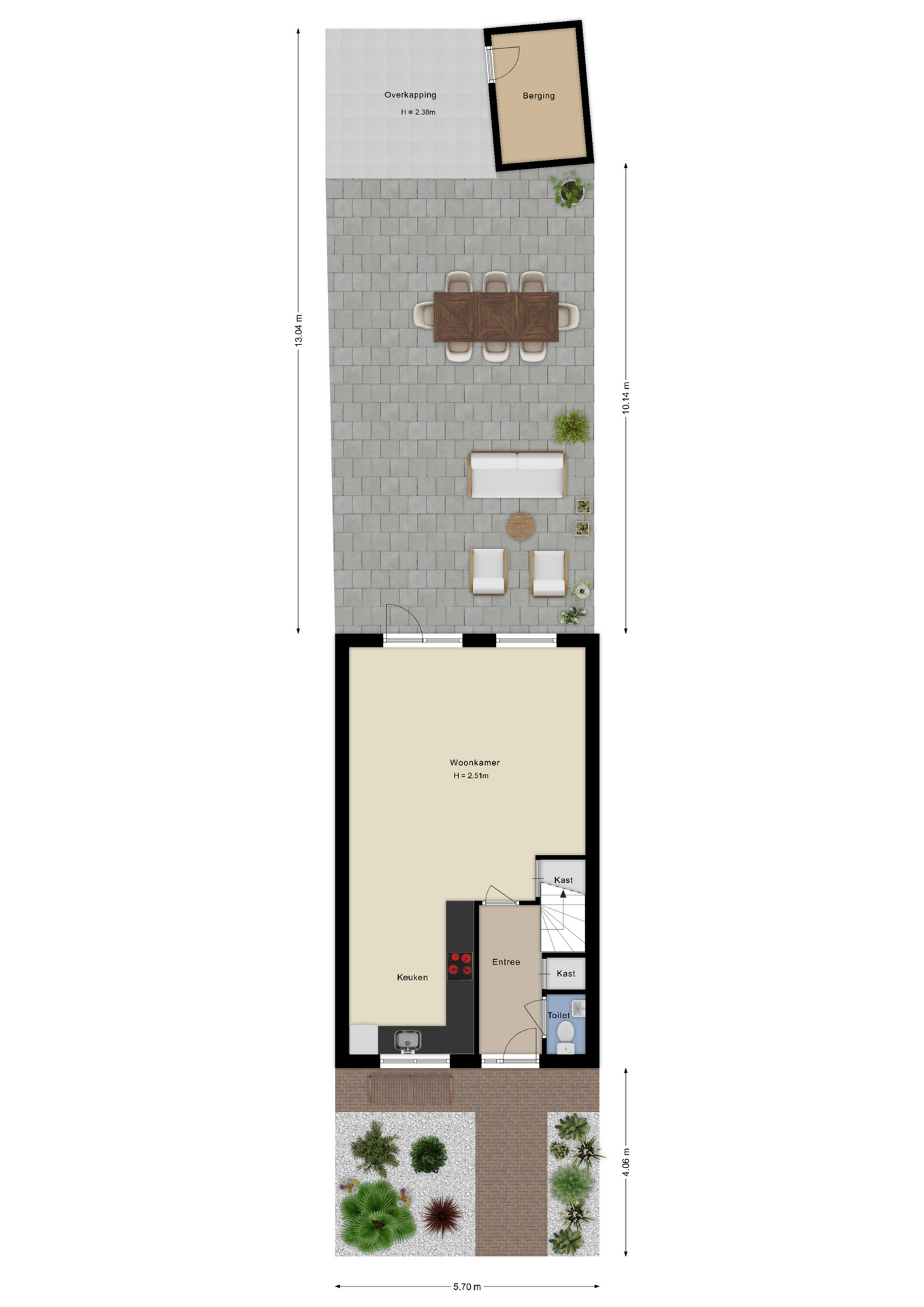 Aansluitend aan de woonkamer vind je een fijne overkapping, die de woonruimte als het ware verlengt naar buiten. De zonnige achtertuin (zuidoost) biedt volop privacy, een stenen berging en een handige achterom; perfect voor fietsen of tuinspullen.