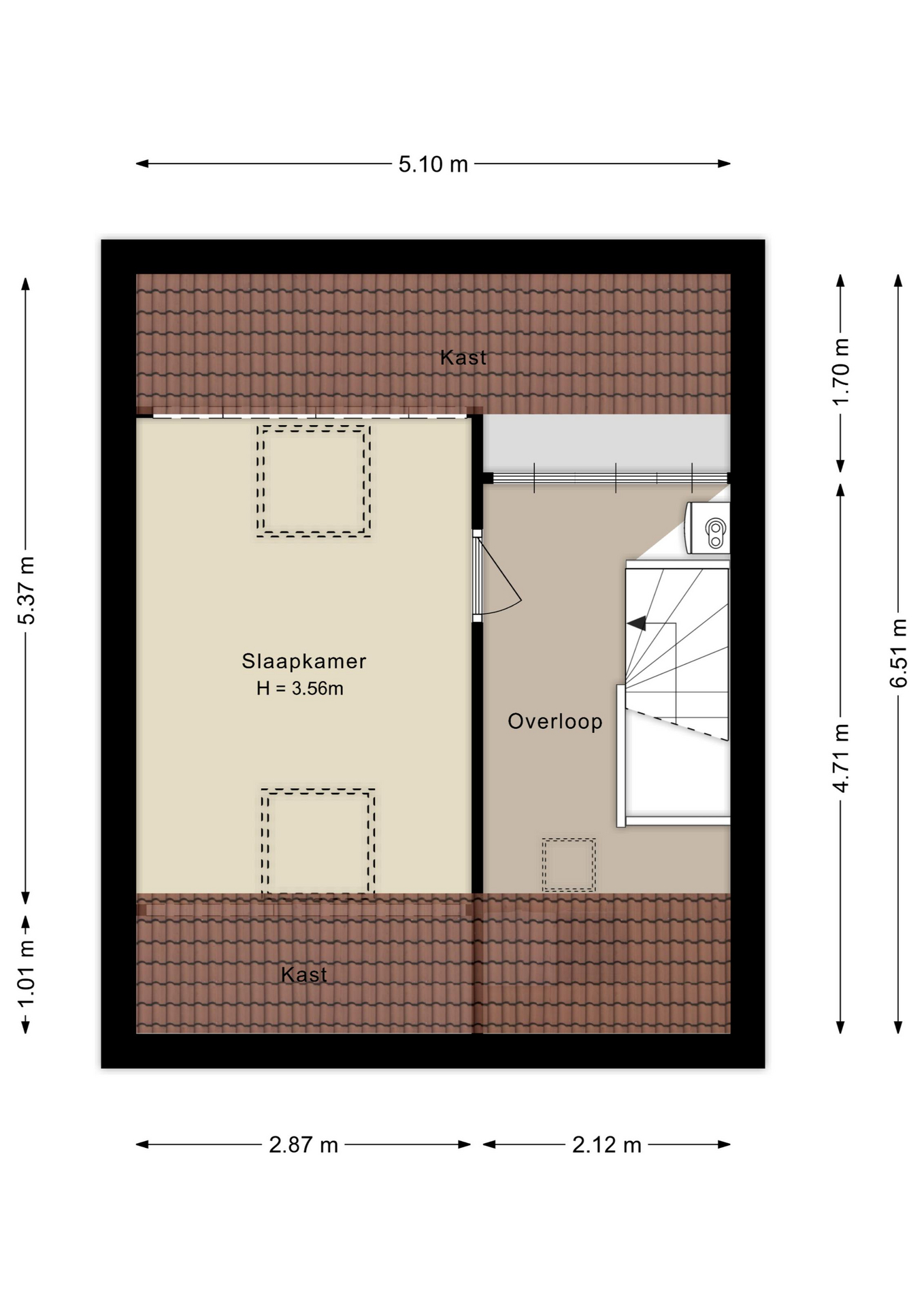 De zolderverdieping biedt een verrassend ruime vierde kamer met grote dakramen, ideaal als extra slaapkamer, werkplek of hobbyruimte. Op de overloop vind je de aansluitingen voor wasmachine en droger, de cv-installatie (Remeha Avanta CW4, 2023) en de mechanische ventilatie.