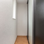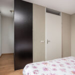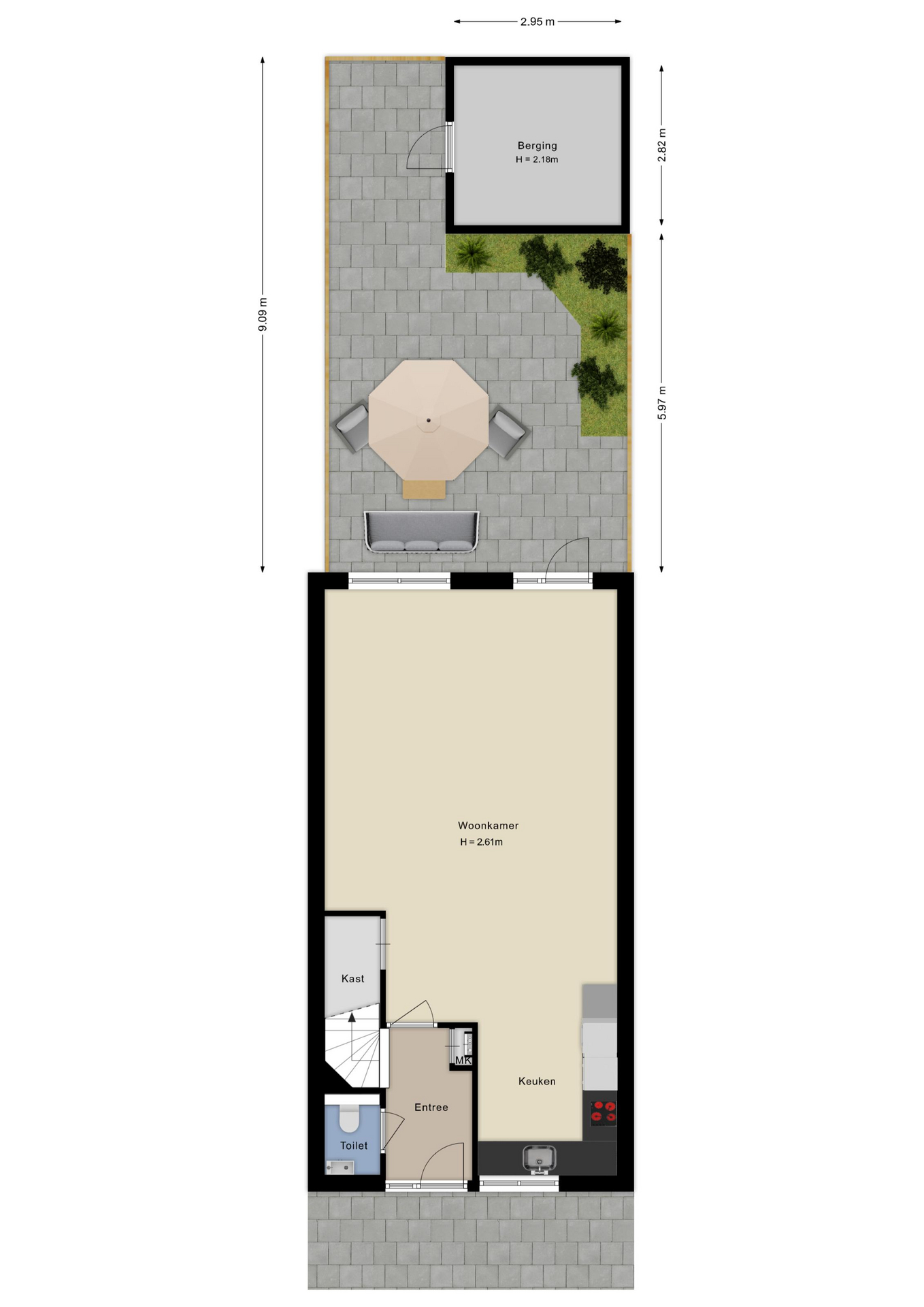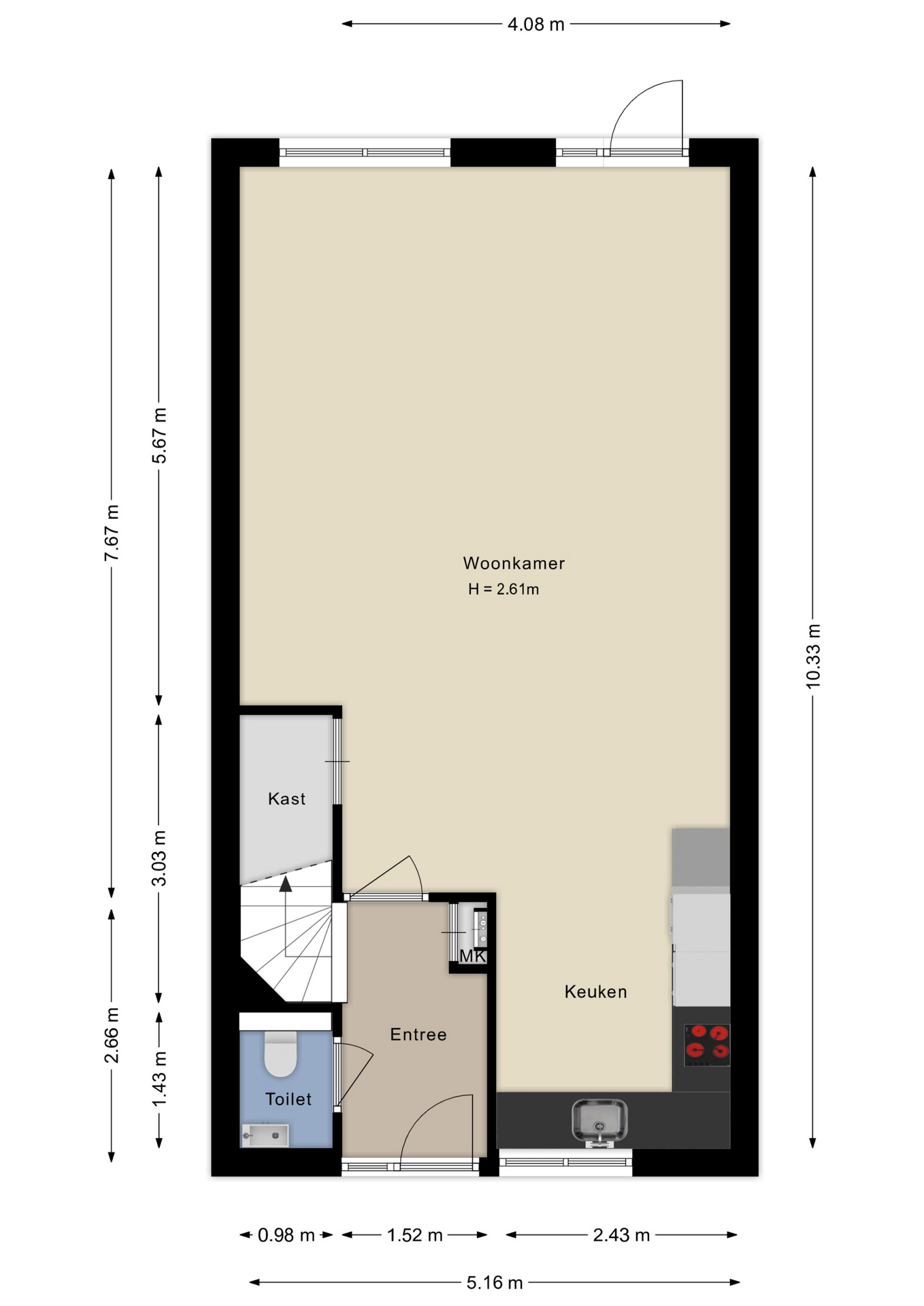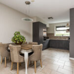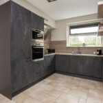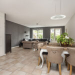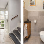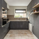 Ruime entree, moderne toiletruimte, meterkast en toegang tot de woonkamer. Aan de voorzijde bevindt zich de zwarte moderne keuken (L-opstelling), recentelijk vernieuwd in 2019. Deze is uitgerust met een oven, magnetron, koel-vriescombinatie, kokend waterkraan van Franke, kookplaat en vaatwasser.