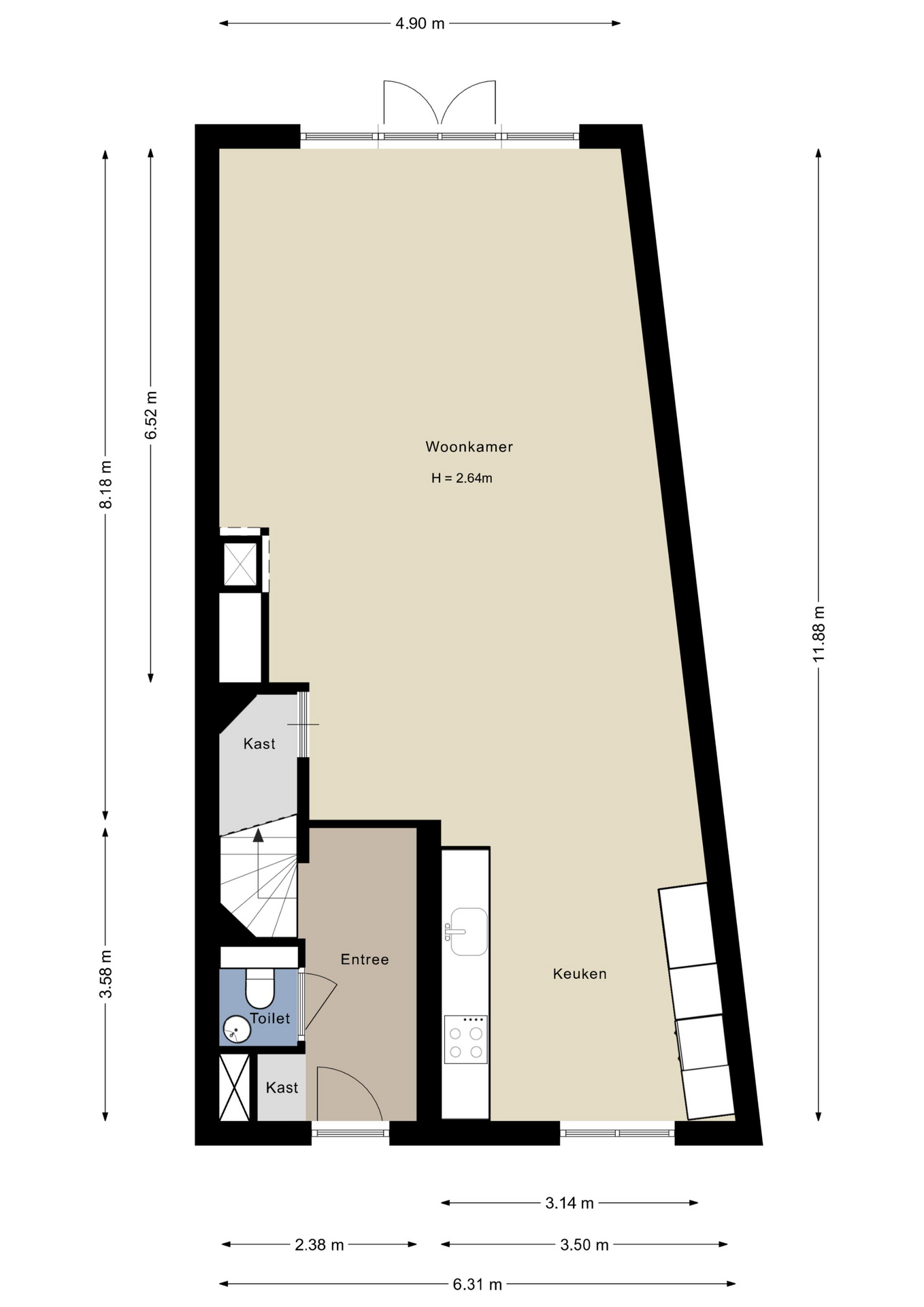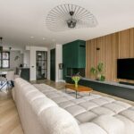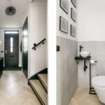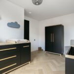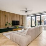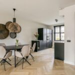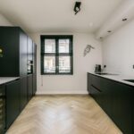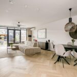 Bij binnenkomst valt direct de stijlvolle afwerking op: glad gestucte wanden en plafonds, een pvc-vloer in Hongaarse punt met vloerverwarming, en een luxe toiletruimte. Via een stoere stalen deur betreedt u de riante, uitgebouwde woonkamer van ruim 40 m². De hoge ramen en openslaande deuren zorgen voor veel lichtinval en een directe verbinding met de tuin. Het op maat gemaakte wandmeubel met geïntegreerde gashaard en akoestische panelen ademt luxe. De airco en trapkast maken het geheel compleet.