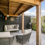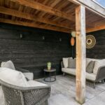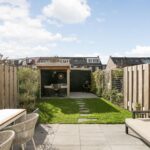 De diepe achtertuin (circa 15 meter) is gelegen op het zonnige zuidwesten en is modern aangelegd met strakke bestrating, groen gazon en houten schuttingen. De robuuste veranda achterin de tuin biedt een beschutte plek om te ontspannen, ook op warme zomerdagen. De dubbele houten berging (ca. 10 m²) is voorzien van elektra en heeft een handige achterom naar het parkeerhof.