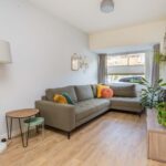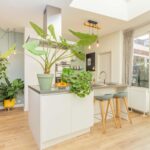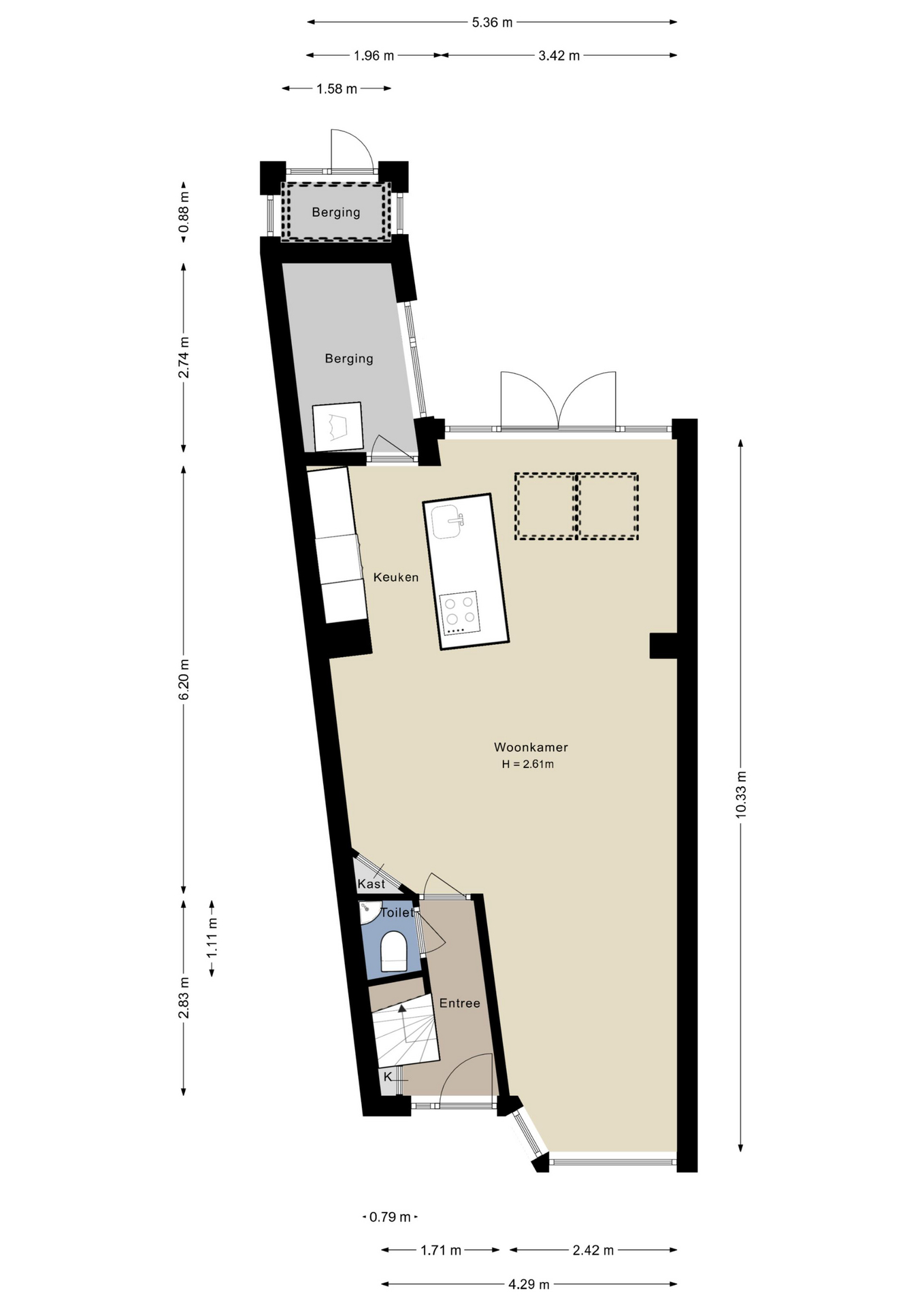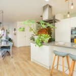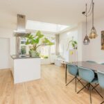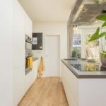 Je komt binnen in de hal, die toegang biedt tot het toilet en de woonkamer. Bij binnenkomst in de woonkamer word je verrast door de royale, lichte en open leefruimte. Aan de voorzijde bevindt zich de gezellige zithoek, terwijl aan de achterzijde een ruime, moderne leefkeuken ligt, met genoeg plek voor een royale 6-persoons eettafel. De lichte keuken (uit 2019) beschikt over een kookeiland, een vaste kastenwand en hoogwaardige inbouwapparatuur zoals een inductiekookplaat, oven met stoomfunctie, combi-oven, koel-vriescombinatie en een vaatwasser.
