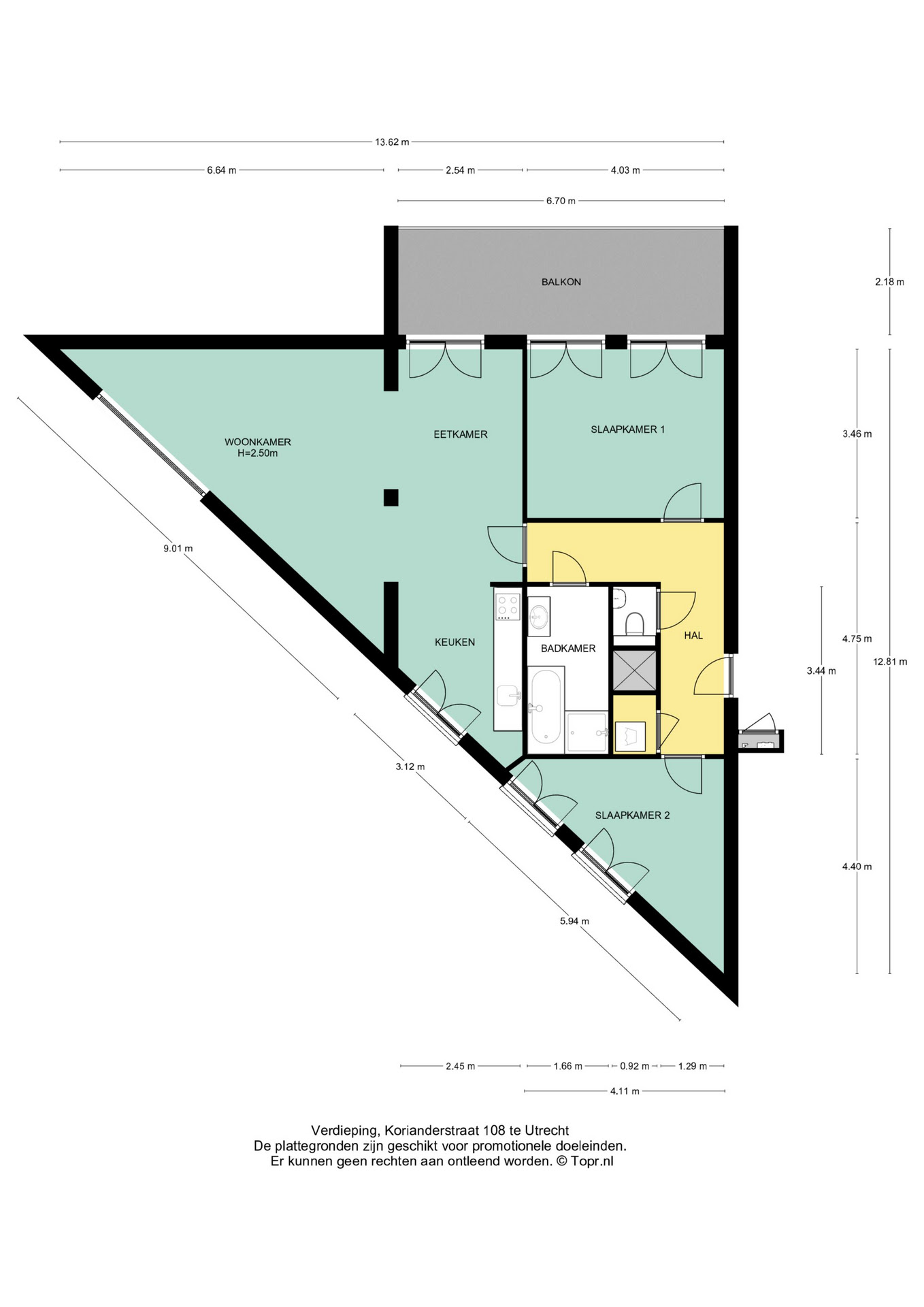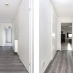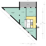 De hal/entree biedt toegang tot alle ruimten is het appartement, namelijk de royale woonkamer met moderne keuken, twee goed bemeten slaapkamers van ca. 14 m2 en 9 m2, de badkamer, meterkast en diverse bergkasten. De woonkamer is voorzien van grote raampartijen en een speelse indeling door de schuine muren. Ook de badkamer is netjes ingericht en beschikt over een douche, wastafelmeubel en ligbad. Het gehele appartement is daarnaast voorzien van een nette vloer- en wandafwerking.