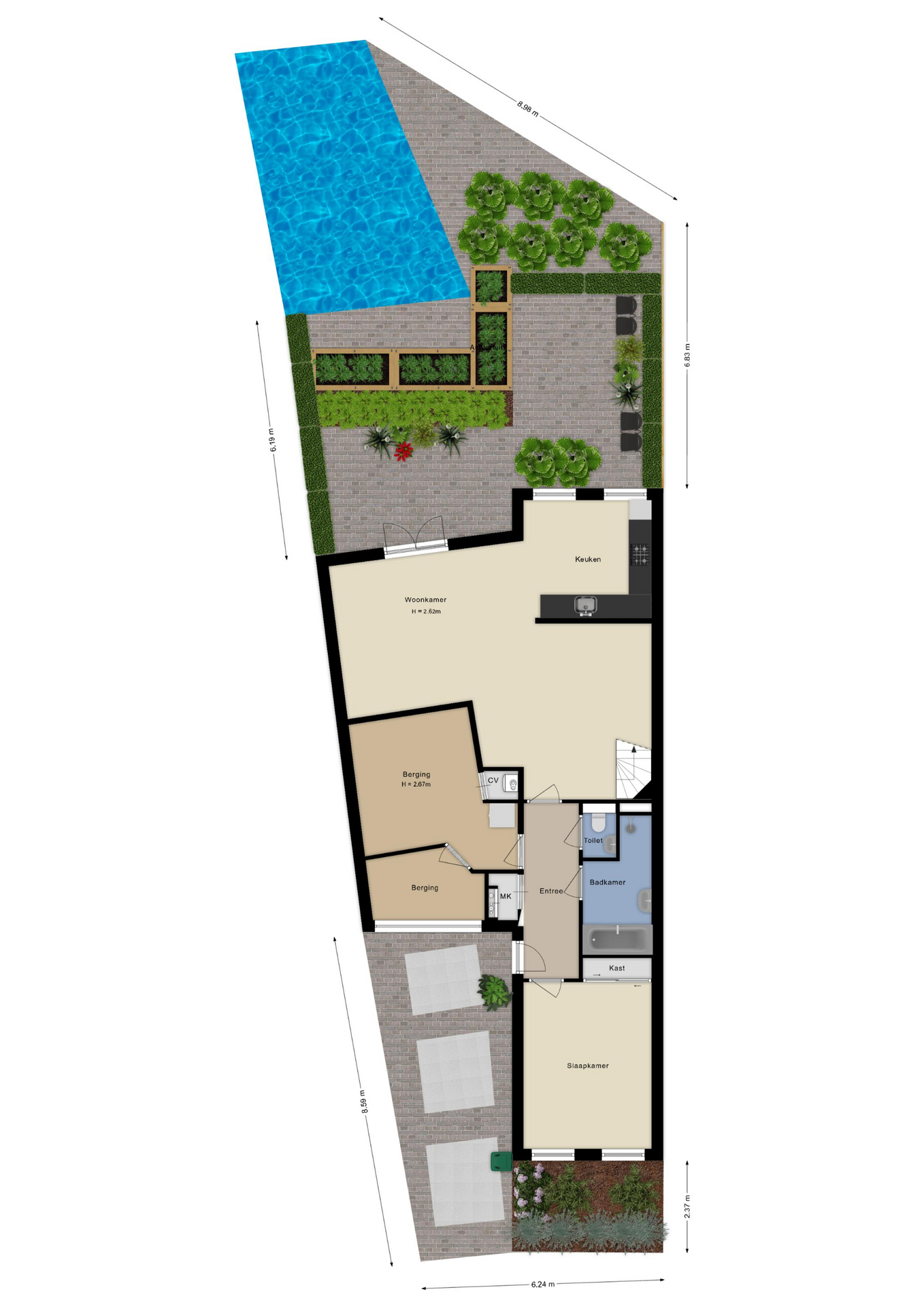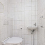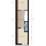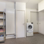 Binnenkomst via de ruime hal met meterkast en toilet. Hier bevindt zich ook de eerste badkamer met douche en wastafel. De inpandige berging (totaal ca. 19 m²) met aansluitingen voor wasapparatuuren en de stookruimte zijn vanuit de hal bereikbaar. Aan de voorzijde ligt een royale slaapkamer met praktische inbouwkast.