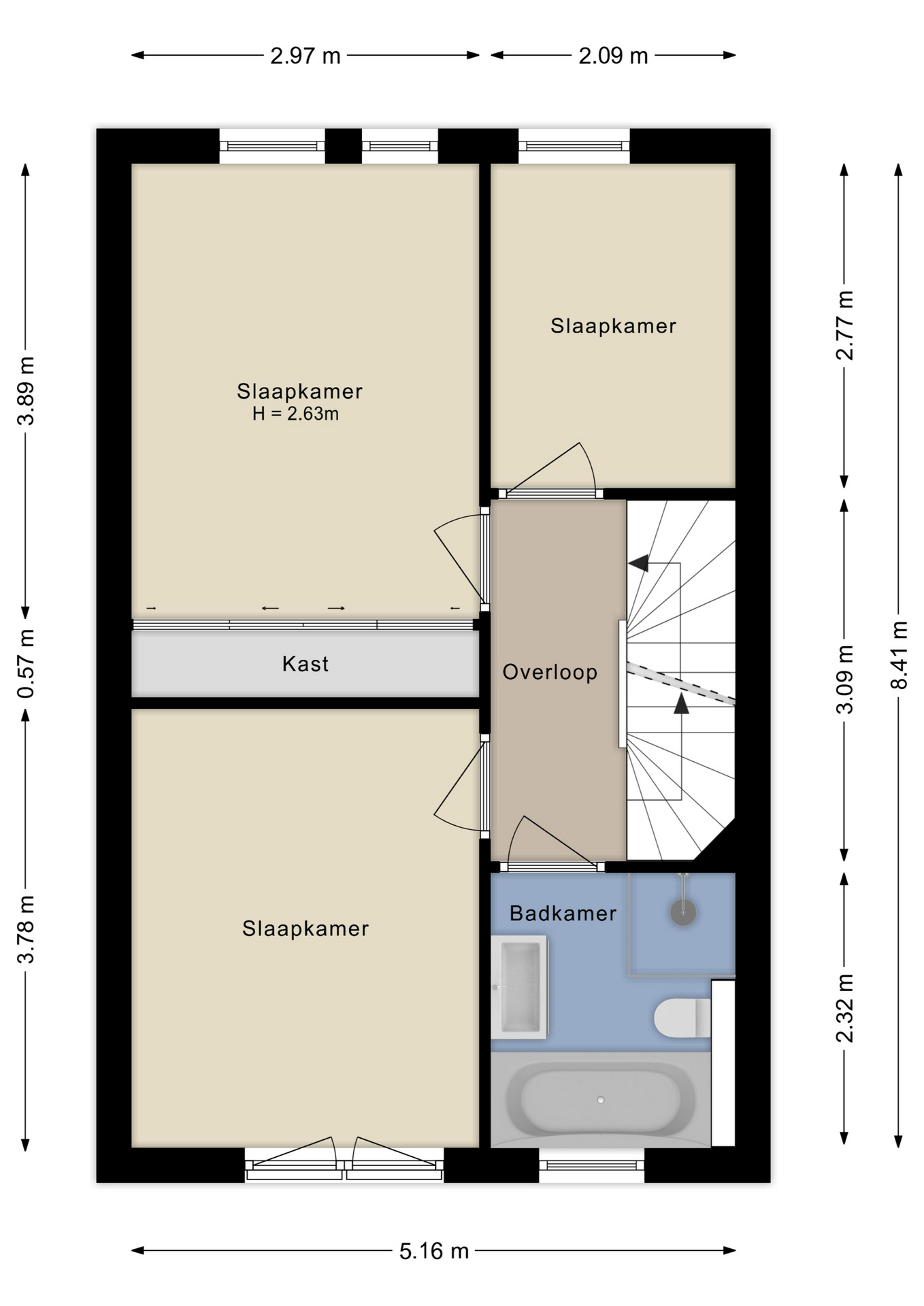 Op deze verdieping vind je drie slaapkamers: twee aan de achterzijde en één aan de voorzijde. Ideaal als kinderkamers, werkkamer of logeerkamer. Één van de slaapkamers is voorzien van een mooie inbouwkast. De moderne badkamer is compleet ingericht met een ligbad, douche, wastafelmeubel, zwevend toilet en designradiator – een fijne plek om de dag ontspannen te beginnen of juist af te sluiten.