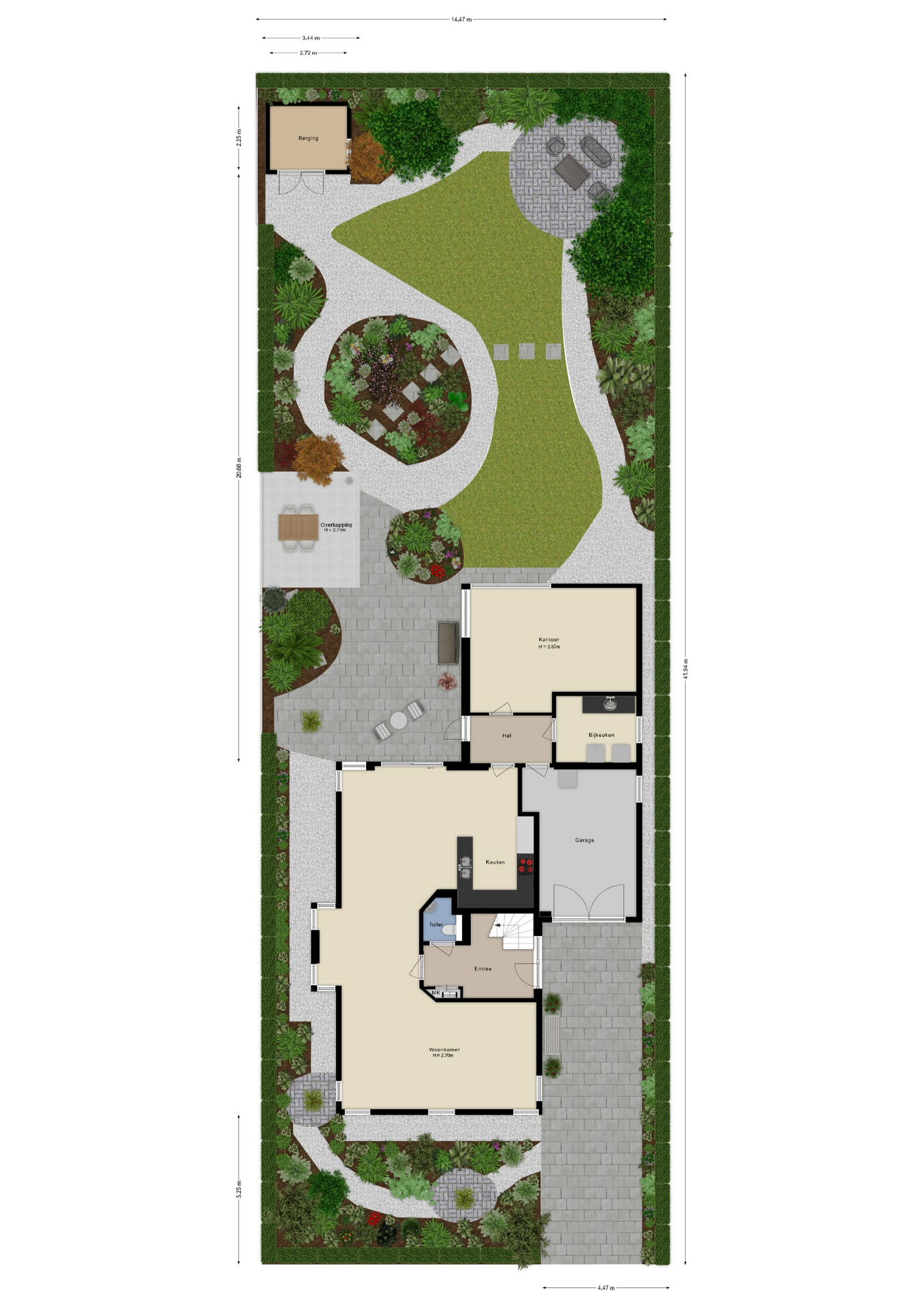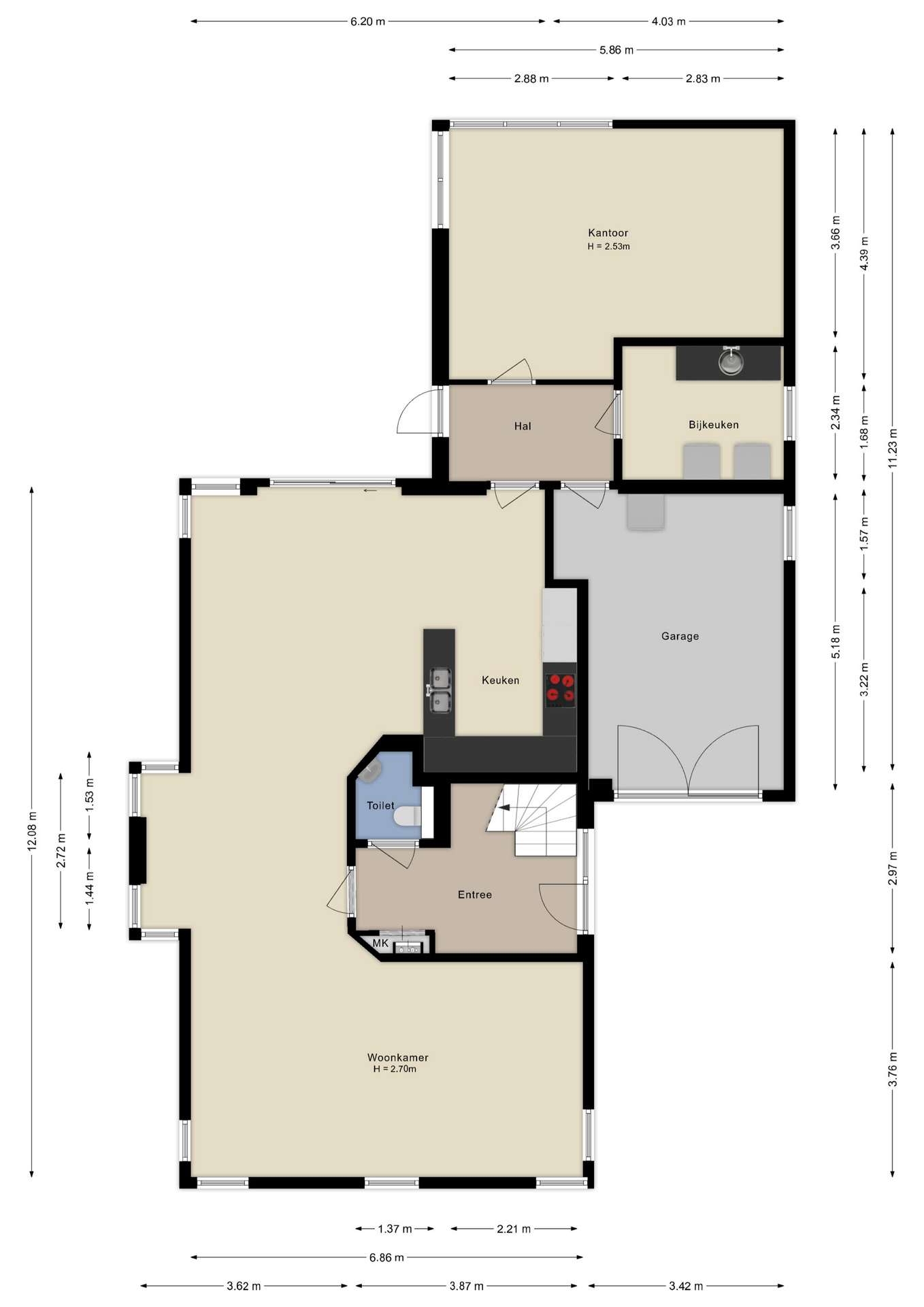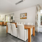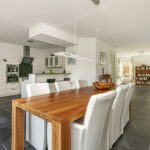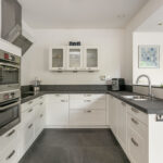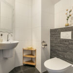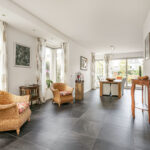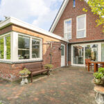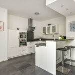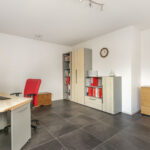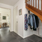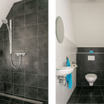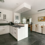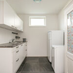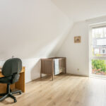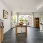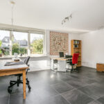 De begane grond heeft een royale werk- of slaapkamer die ideale voorwaarden creëert voor verschillende doeleinden: een home office, praktijk aan huis, een extra slaapkamer of een hobbykamer. De woonkamer biedt een zee aan ruimte en licht, dankzij de royale raampartijen die het zonlicht gul binnenlaten. Vanuit het eetgedeelte, waar ruimte is voor een grote eettafel, geven de schuifdeuren direct toegang tot de achtertuin. Ideaal voor die zomerse dagen waarop binnen- en buitenleven naadloos in elkaar overgaan. Voor het praktische gemak is er een bijkeuken aanwezig, compleet met aansluitingen voor de wasmachine en droger. Zo blijft het huishouden georganiseerd en buiten zicht, zonder afbreuk te doen aan de stijl en ruimtelijkheid van de woning.