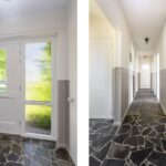 Entree, ruime hal met natuurstenen tegelvloer, lambrisering en gestucte wanden, meterkast, verzorgde toiletruimte en toegang tot alle overige ruimten.