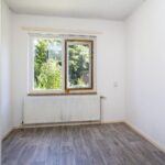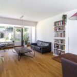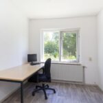 De woonkamer ligt aan de rechterzijde van de woning en biedt via de grote raampartijen en erker prachtig en vrij uitzicht over de achtertuin. De kamer is voorzien van een parketvloer, vaste kast en tuindeur.