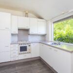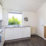 De keuken bevindt zich aan de andere zijde van de woning en deze is voorzien van een wit keukenblok in hoekopstelling met voldoende werk- en kastruimte en diverse (inbouw-)apparatuur, te weten; koelkast, gaskookplaat, combimagnetron, vaatwasser en vlakscherm afzuigkap.