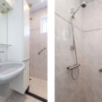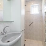 De keurige badkamer is klein, maar functioneel en voorzien van een inloopdouche met thermostaatkraan, wastafel, badkamerkast en designradiator.