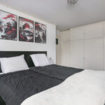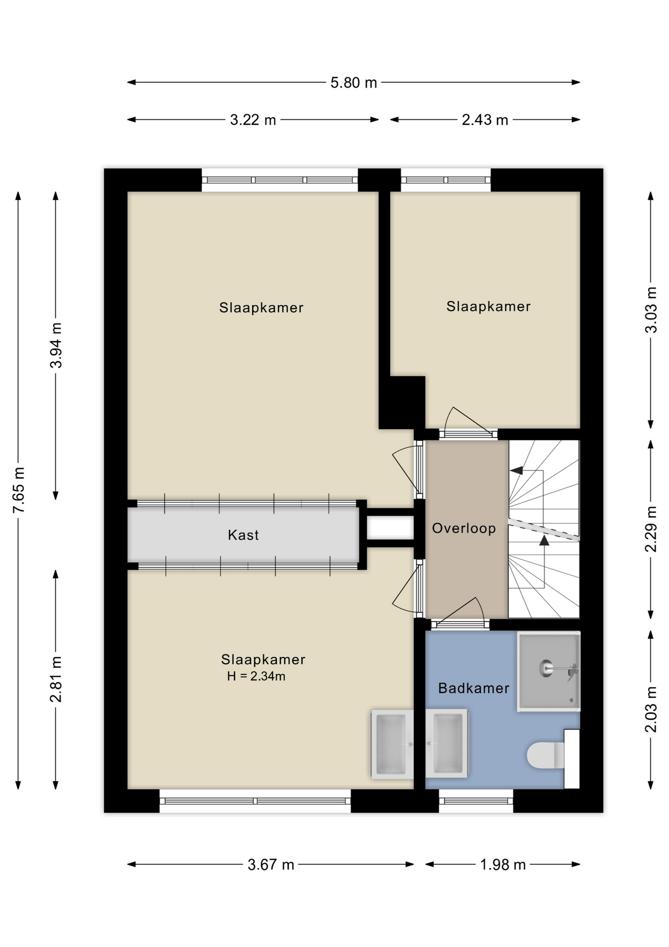 Vanaf de brede overloop bereik je drie verzorgde slaapkamers, allen met grote ramen en een nette laminaatvloer; twee kamers hebben een inbouwkast. De moderne, volledig betegelde badkamer is uitgerust met een wastafelmeubel, toilet en inloopdouche.