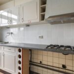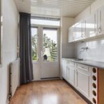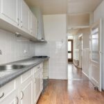 De dichte keuken is aan de achterzijde gelegen en voorzien van een eenvoudig keukenblok, vaste kast en deur naar de achtertuin.