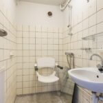 De standaard afgewerkte en compacte badkamer is voorzien van een granito vloer, douche en wastafel.