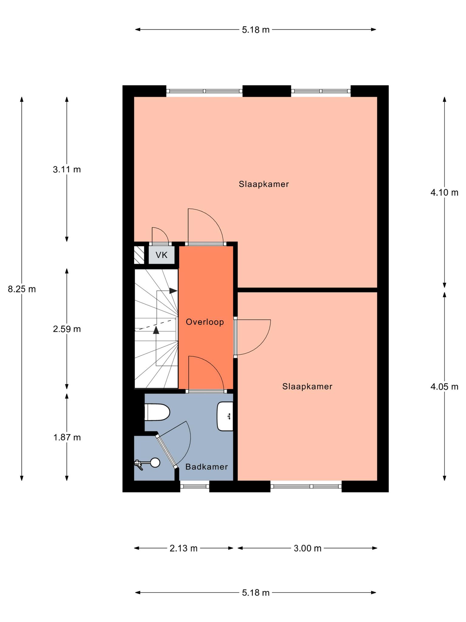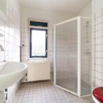 Overloop, 2 slaapkamers, badkamer met douche, toilet en wastafel.