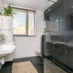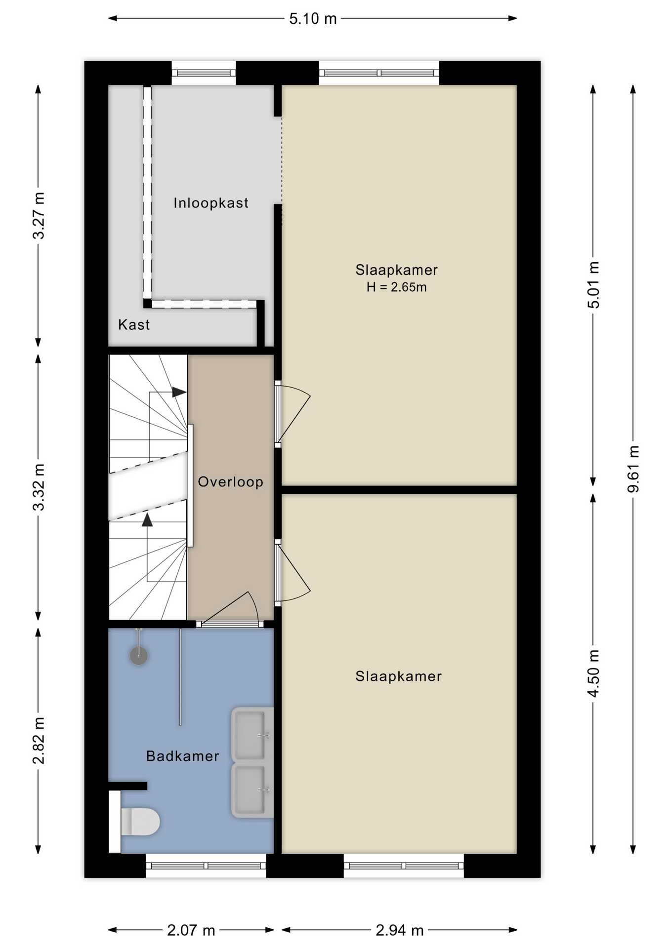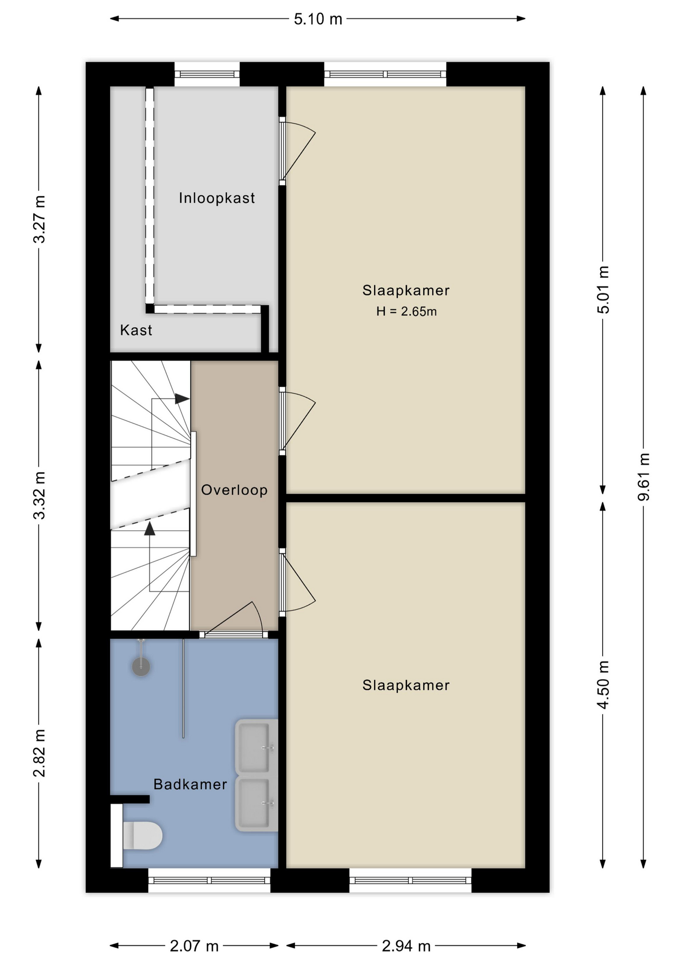 De overloop biedt toegang tot twee goed gemeten slaapkamers, beide afgewerkt met een laminaatvloer. De ruime hoofdslaapkamer aan de achterzijde is verbonden met een royale inloopkastenkamer. De badkamer is verzorgd en compleet: voorzien van dubbele wastafel, inloopdouche en toilet.