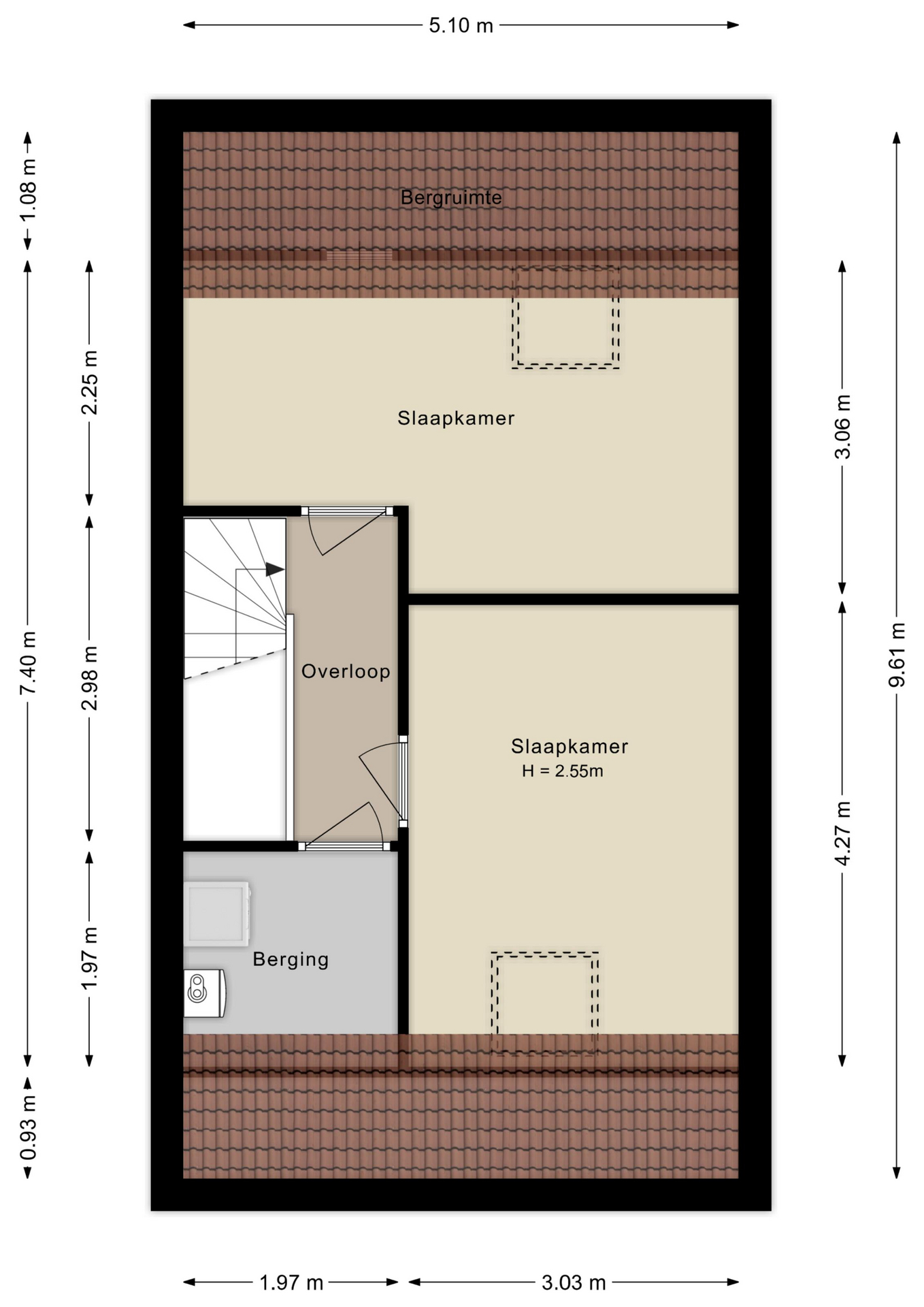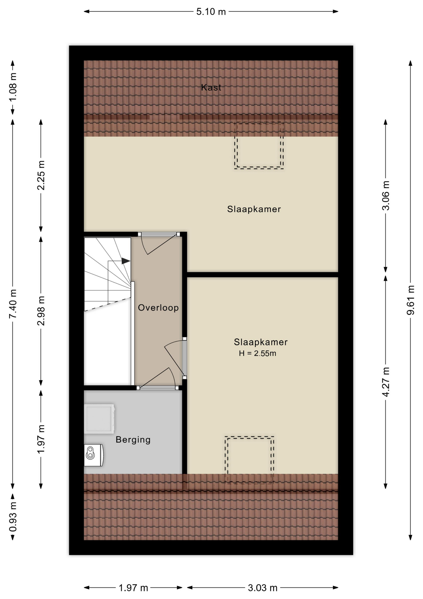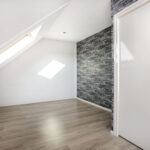Op deze verdieping vind je nog twee slaapkamers, beide met een dakraam voor extra lichtinval. Daarnaast is er een aparte kamer met opstelplaats voor de cv-ketel, de wasmachine en de wasdroger. Via een vlizotrap bereik je een royale bergvliering.