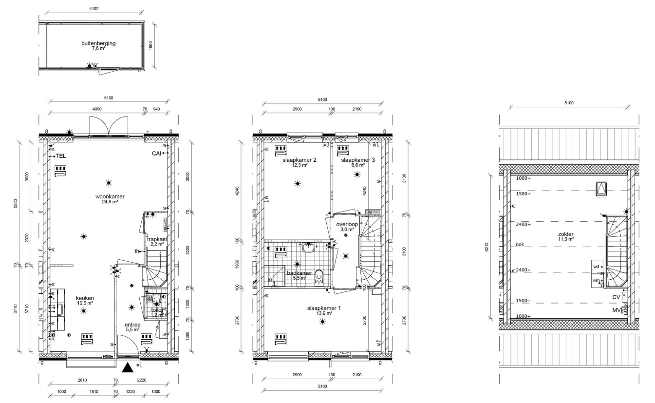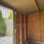 • Vrijstaande houten berging in de achtertuin, voorzien van elektra.