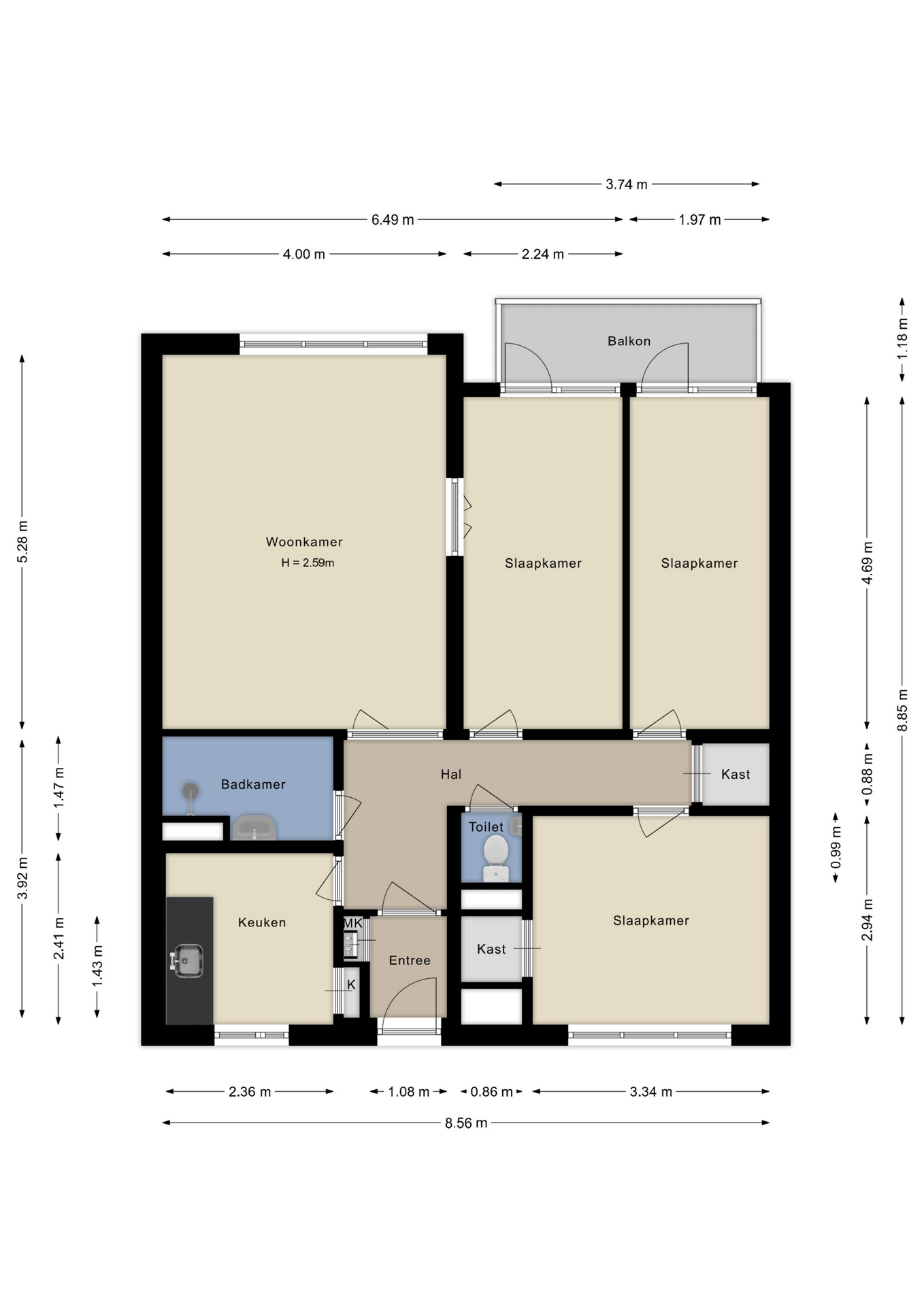 Via de voordeur kom je binnen in de entree met meterkast. De centrale hal geeft toegang tot alle vertrekken en is voorzien van een vaste kast voor extra bergruimte. De woonkamer is heerlijk licht dankzij de grote ramen en biedt uitzicht op de binnentuin. Aansluitend bevindt zich een multifunctionele kamer; bijvoorbeeld te gebruiken als extra slaapkamer, werk- of hobbyruimte met openslaande deuren naar het balkon op het zuidwesten. Hier geniet je volop van middag- en avondzon. Aan de achterzijde bevindt zich tevens de tweede slaapkamer, die eveneens toegang biedt tot het balkon. De derde slaapkamer aan de voorzijde beschikt over een praktische inbouwkast. De aparte keuken is voorzien van een eenvoudig keukenblok met afzuigkap en ruimte voor de cv-installatie. De badkamer is betegeld en uitgerust met een douche, wastafel en aansluiting voor de wasmachine. Het toilet met fonteintje bevindt zich apart van de badkamer.