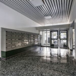 Afgesloten hoofdentree met brievenbussen, bellentableau, trappenhuis en toegang tot de privéberging.