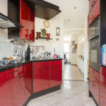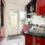 De dichte keuken ligt aan de achterzijde van de woning en is voorzien van een gaskookplaat, afzuigkap, combi-oven, koel-vriescombinatie en vaatwasser. Vanuit de keuken stap je zo de diepe achtertuin in.