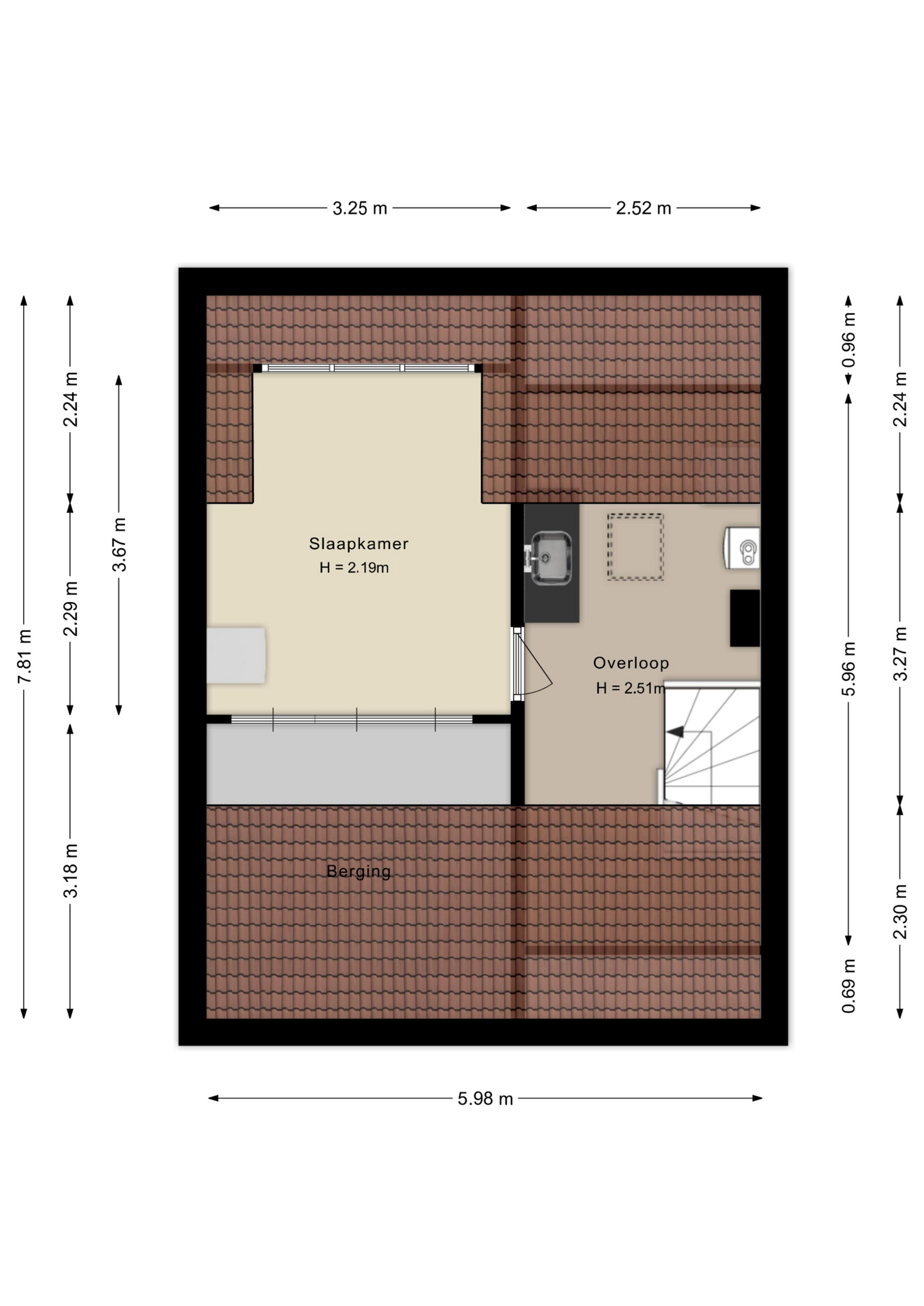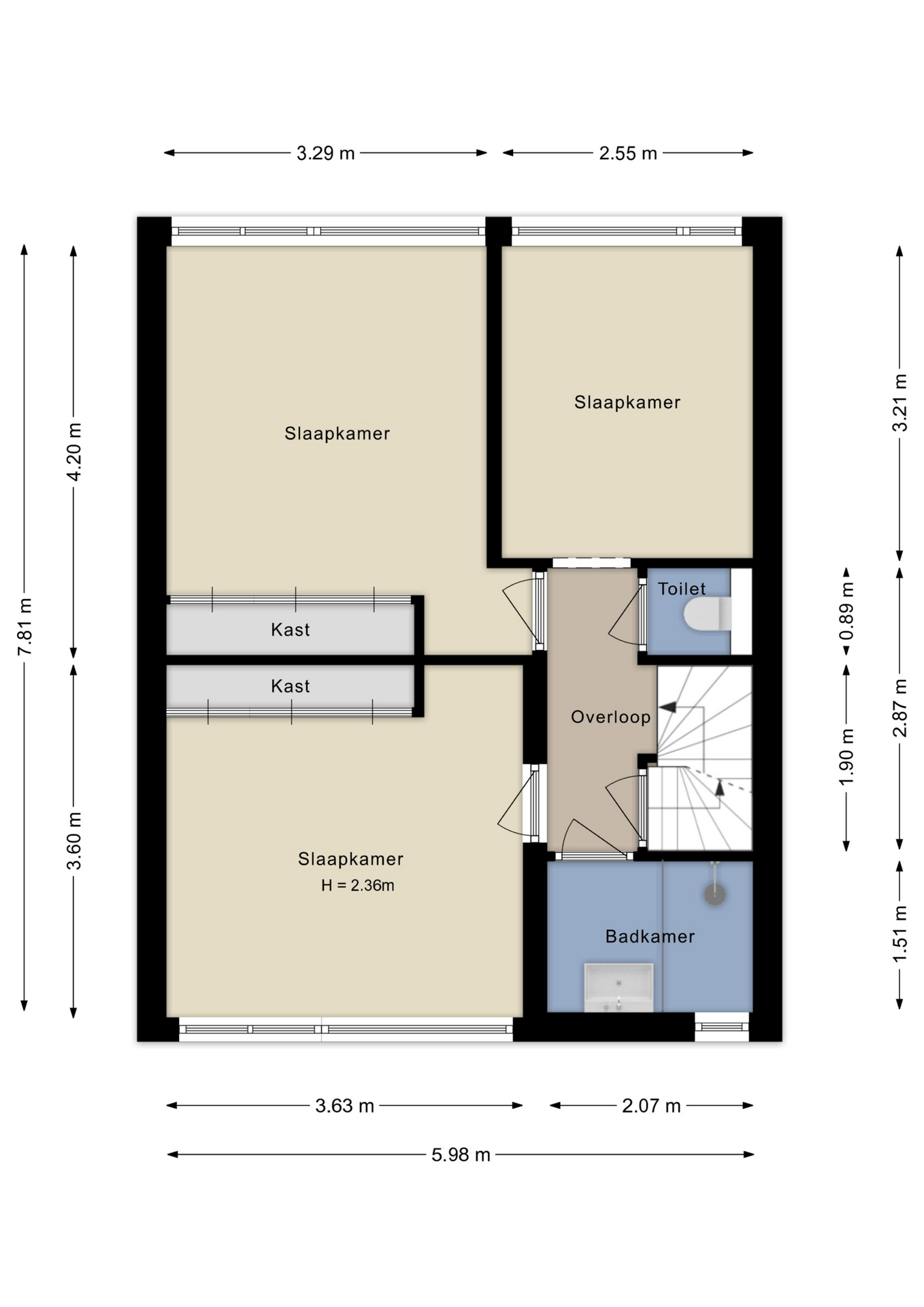 De overloop geeft toegang tot drie slaapkamers, waarvan twee met handige inbouwkasten. Daarnaast is er een separate toiletruimte.