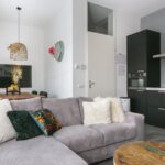 Je komt binnen via de hal met garderobe, nette toiletruimte en inbouwkast met witgoedaansluitingen. Vervolgens bereik je de sfeervolle living, die door grote raampartijen aan zuidzijde heerlijk zonnig is. Het vertrek is voorzien van vloerverwarming en biedt plaats voor een aparte eethoek, hoge plafonds geven een ruimtelijk gevoel. Een openslaande deur geeft toegang tot het terras. In de living vind je tevens de open keuken, bestaande uit een recht keukenmeubel met lades en kasten in zwart. Een chique marmeren werkblad maakt het helemaal af. Inbouwapparatuur betreft een inductiekookplaat, afzuigkap, combi-oven, vaatwasser, vriezer en koelkast.