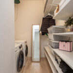 Private hallway within the apartment with access to the storage/laundry room, a generous master bedroom, a bathroom, and the large living room with an open-concept kitchen.