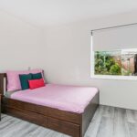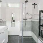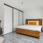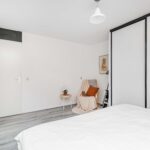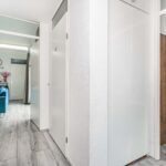 Vanuit de woonkamer bereik je de masterbedroom (ca. 18 m²) met ruime schuifkast, de moderne badkamer, de multifunctionele kamer/berging en de patio. De badkamer, vernieuwd in 2021, is voorzien van een moderne douche, wastafelmeubel met houten details, spiegelkast en een aansluiting voor de wasmachine.
