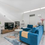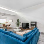 De living vormt het hart van de woning – een open, lichte ruimte met meerdere ramen en een prettig uitzicht op de patio. De open keuken in landelijke stijl is voorzien van een houten werkblad, bovenkastjes, koelkast, combi-oven en afzuigkap.