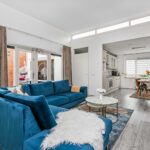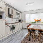 The living area is the heart of the home – light-filled and inviting, with large windows overlooking the patio. The open-plan kitchen, designed in a country style, features a wooden worktop, upper cabinets, refrigerator, combi-oven and extractor fan.