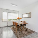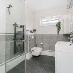 The bathroom, fully renovated in 2021, includes a modern shower, wooden vanity unit with mirror cabinet, and a washing machine connection. The multifunctional room (approx. 7 m²) can be accessed from both inside and outside — perfect for use as a home office, hobby room or secure storage for bikes.