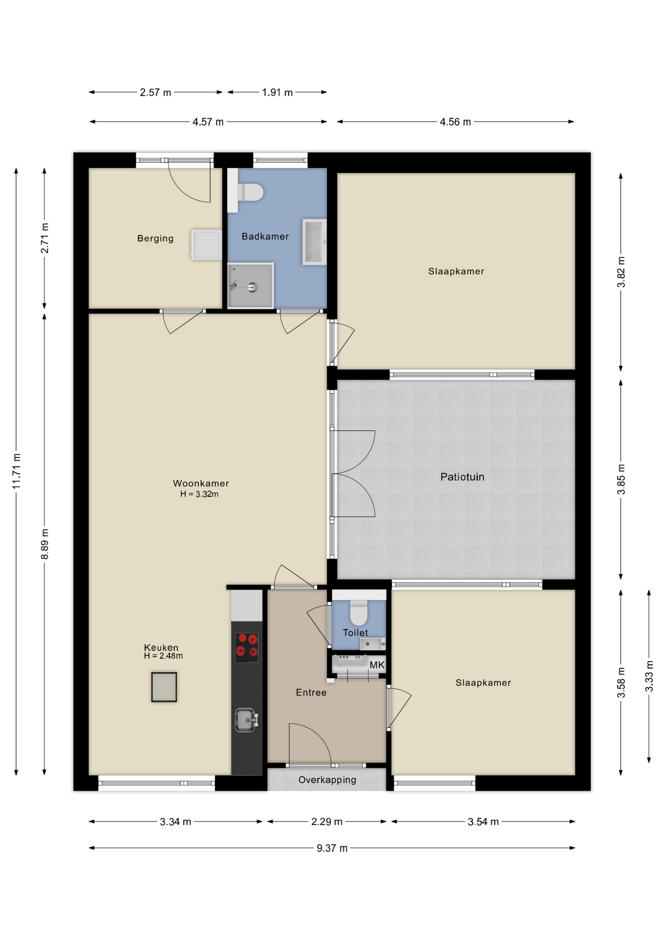 De patio (ca. 18 m²) ligt centraal in de woning en is bereikbaar via de woonkamer. Door de beschutte ligging biedt deze plek veel privacy – een heerlijke buitenruimte voor ontspanning, eten of gezellig samenzijn.