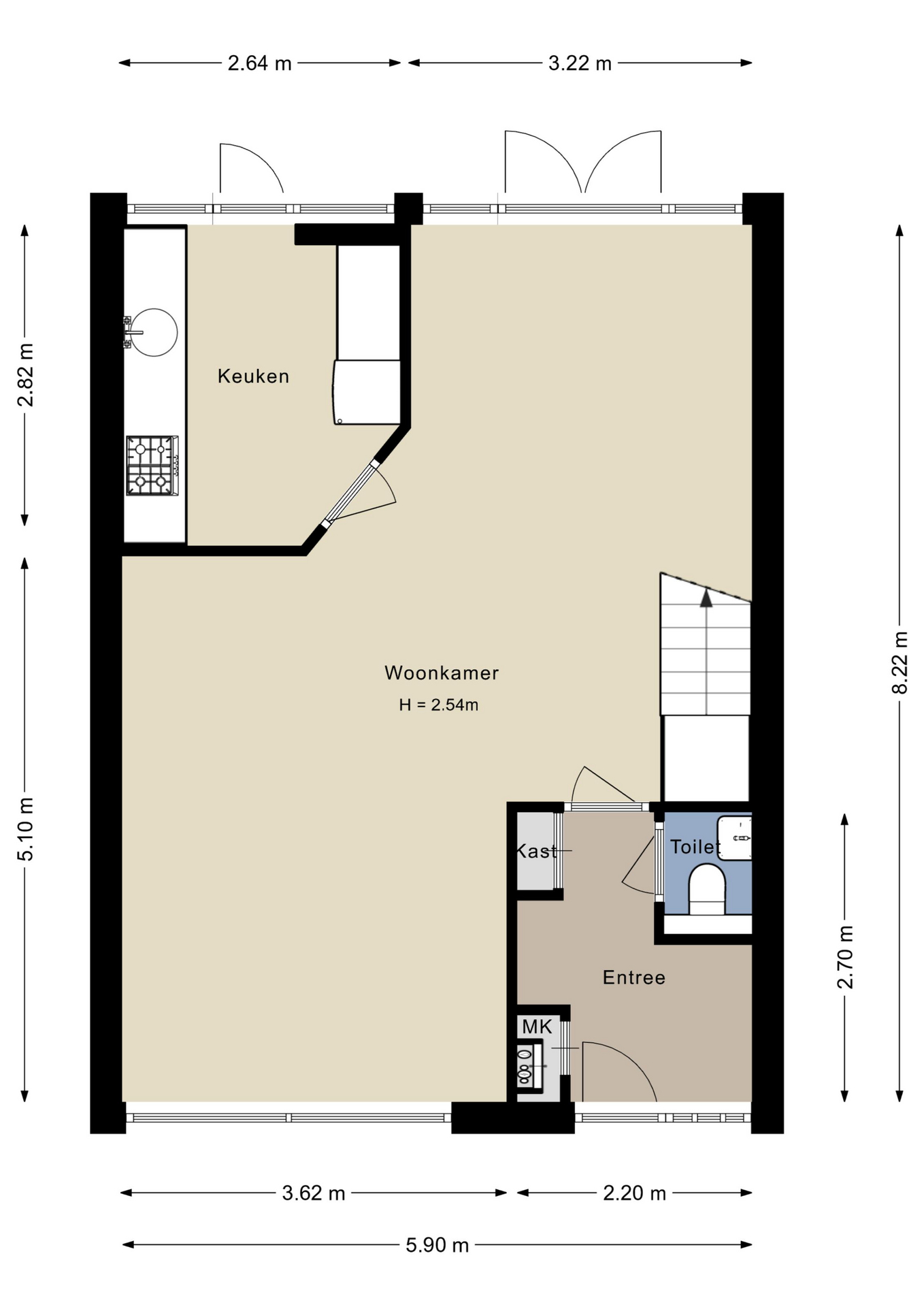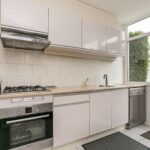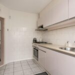 De aan de achterzijde gelegen, dichte keuken is vanuit de woonkamer toegankelijk en is voorzien van een standaard keukenblok met gaskookplaat, oven en RVS afzuigkap. Ook in de keuken is er een kunststof deur naar de achtertuin.
