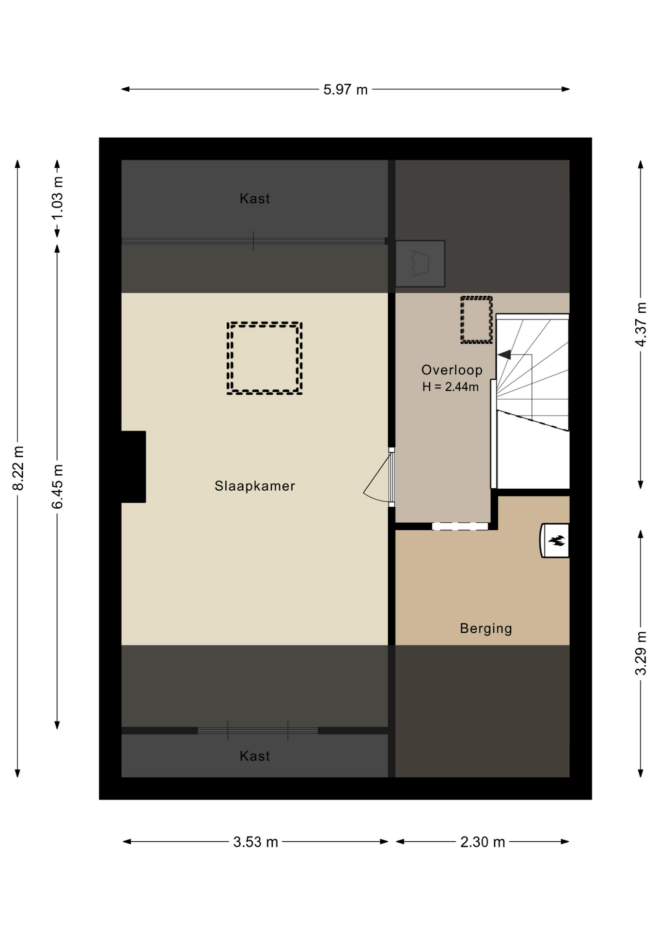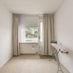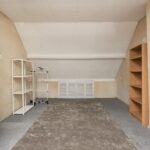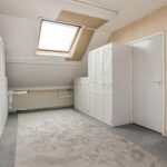 De multifunctionele zolderkamer is zeer ruim van afmeting, afgewerkt met vloerbedekking en behang en voorzien van een Velux-dakraam, vaste kasten en bergruimte achter de knieschotten.