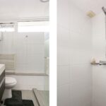 De compacte en geheel betegelde badkamer is modern uitgevoerde en voorzien van een inloopdouche met thermostaatkraan, badmeubel met wastafel, designradiator, closet en kunststof raampartij.