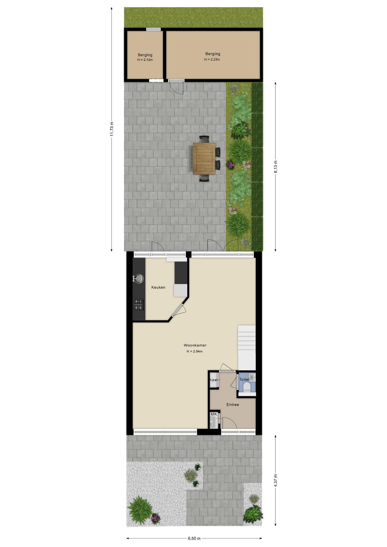 De ruime en vrij gelegen achtertuin is volledig met sierbestrating aangelegd en beschikt over een stenen schuur met elektra, werkbank en vaste stellage en houten berging met deur naar de achtergelegen poort.