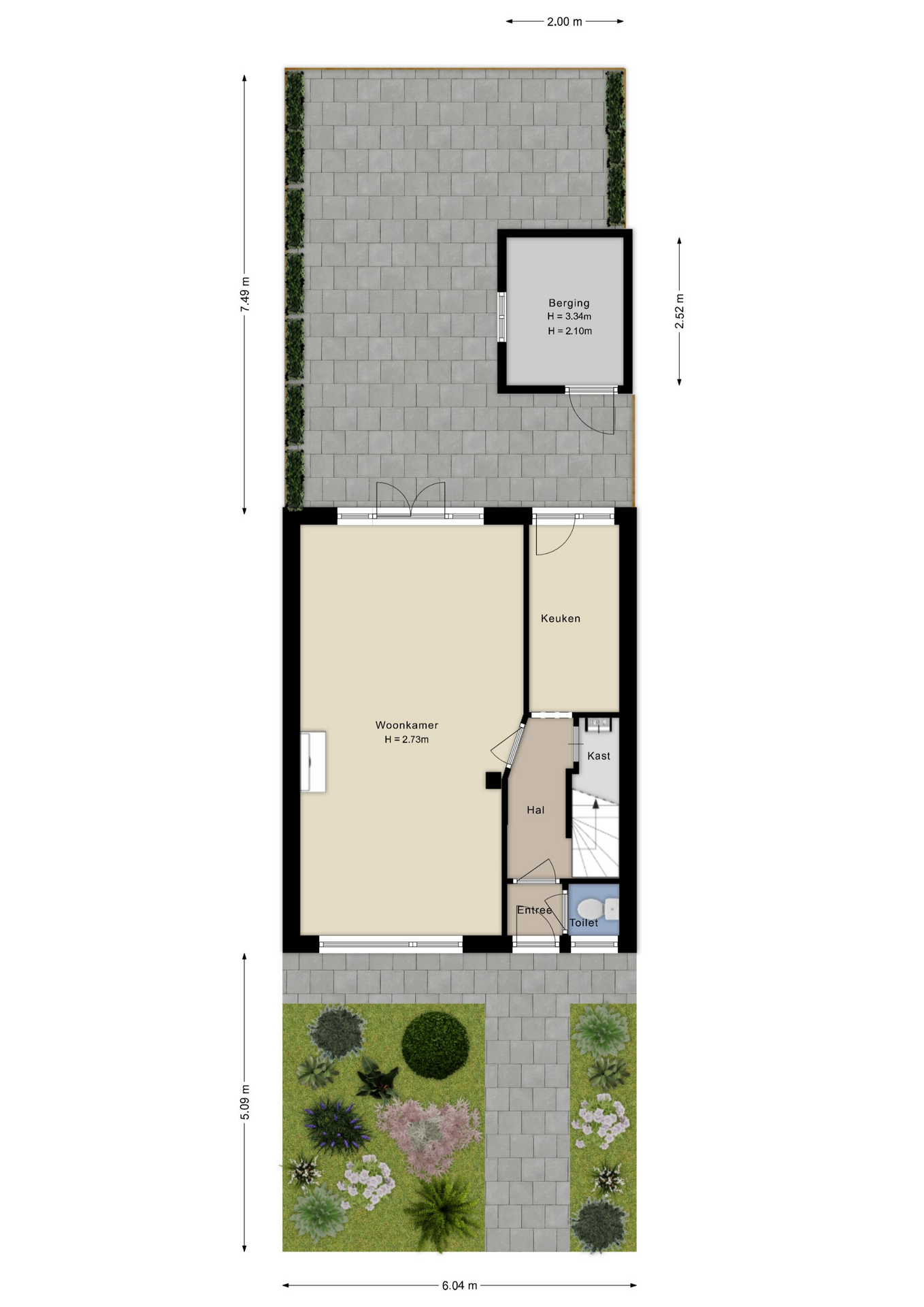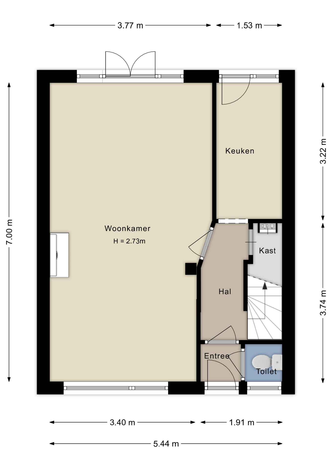 Entree, hal met toegang tot toilet, trapopgang en trapkast met vernieuwde stoppenkast. De doorzonwoonkamer is voorzien van vloerbedekking, hoge plafonds en een schouw. Via de dubbele openslaande deuren is de achtertuin bereikbaar. Aan de achterzijde bevindt zich de dichte keuken met granito vloer; de keukenopstelling is verwijderd, waardoor de ruimte volledig naar eigen inzicht kan worden ingericht. Ook vanuit hier is er toegang tot de tuin.