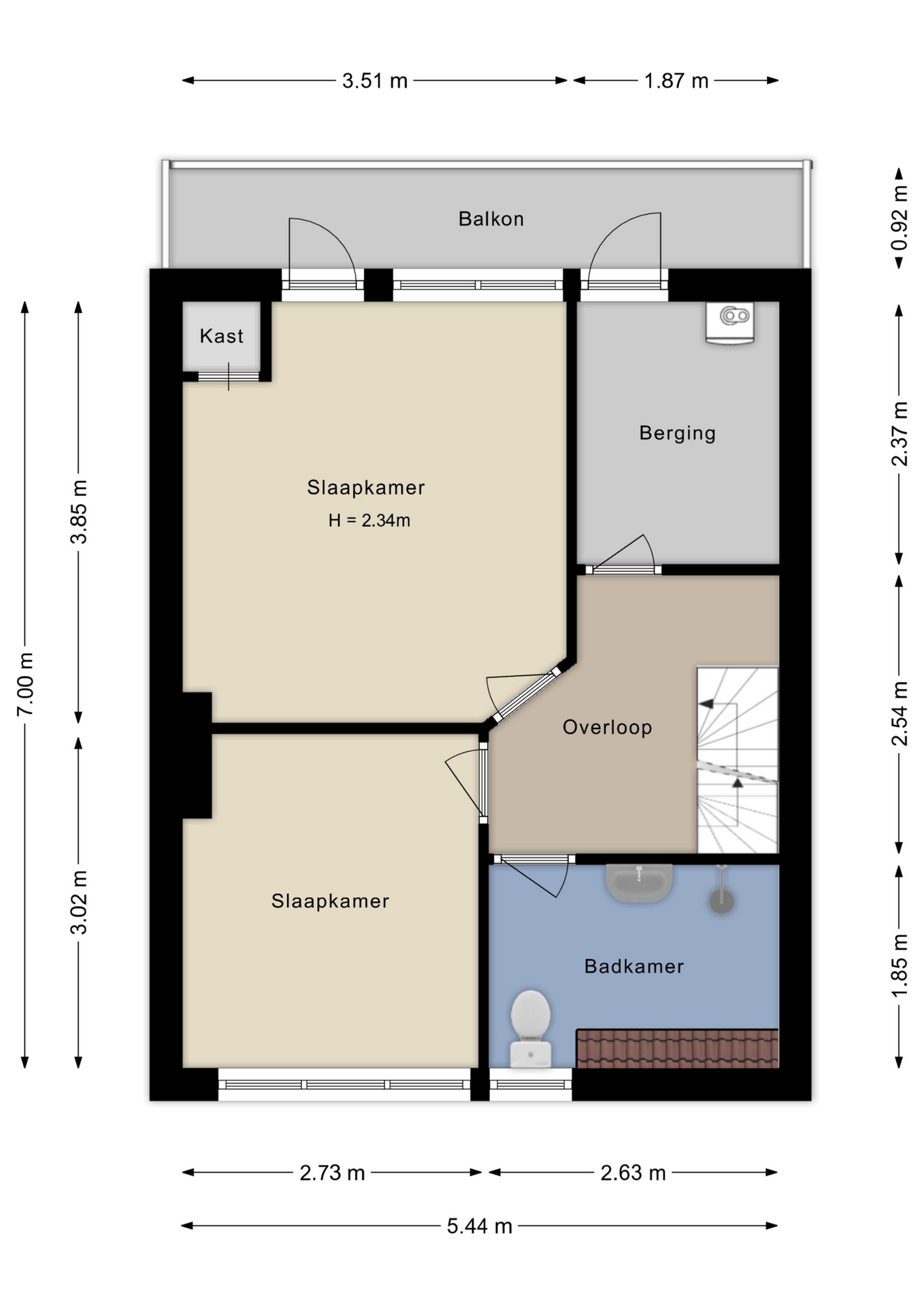 Slaapkamer één ligt aan de achterzijde en is ruim van formaat, voorzien van een vaste kast en toegang tot het balkon. Slaapkamer twee bevindt zich aan de voorzijde en beschikt over een dakkapel. De badkamer aan de voorzijde is ingedeeld met een tweede toilet, wastafel en douche.
