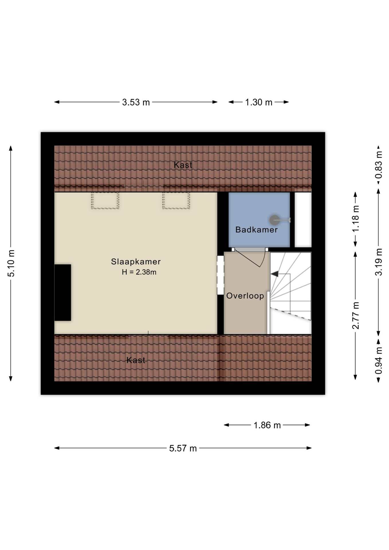 Via een vaste, beklede trap bereik je de zolderverdieping. De overloop geeft toegang tot een extra doucheruimte en slaapkamer drie. Deze slaapkamer beschikt over twee nieuwe dakramen en bergruimte achter de knieschotten.