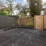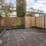De achtertuin ligt op het oosten en is onderhoudsvriendelijk ingericht met grote terrastegels en borders. Dankzij de achterom is de tuin ook praktisch bereikbaar.